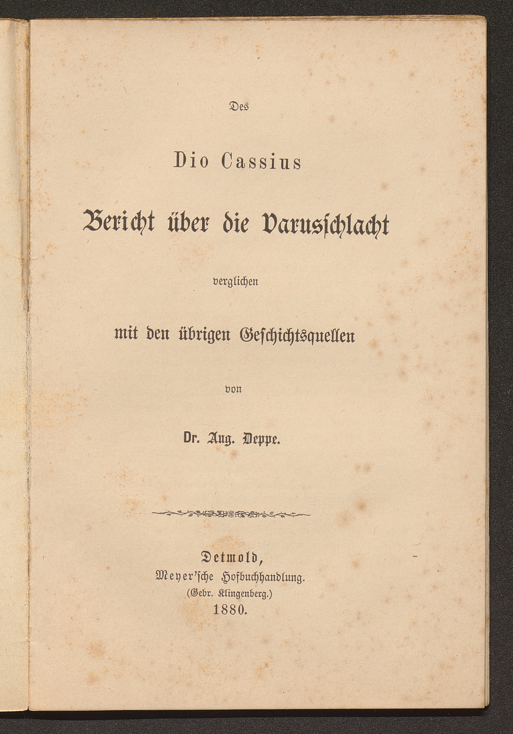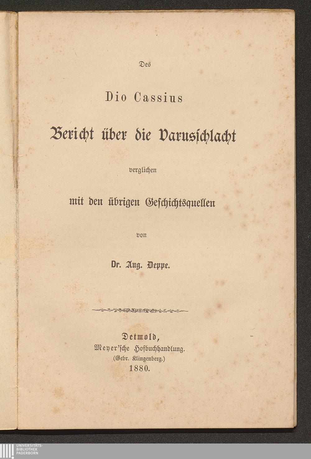 Des Dio Cassius Bericht über die Varusschlacht, verglichen mit den übrigen Geschichtsquellen / von Aug. Deppe