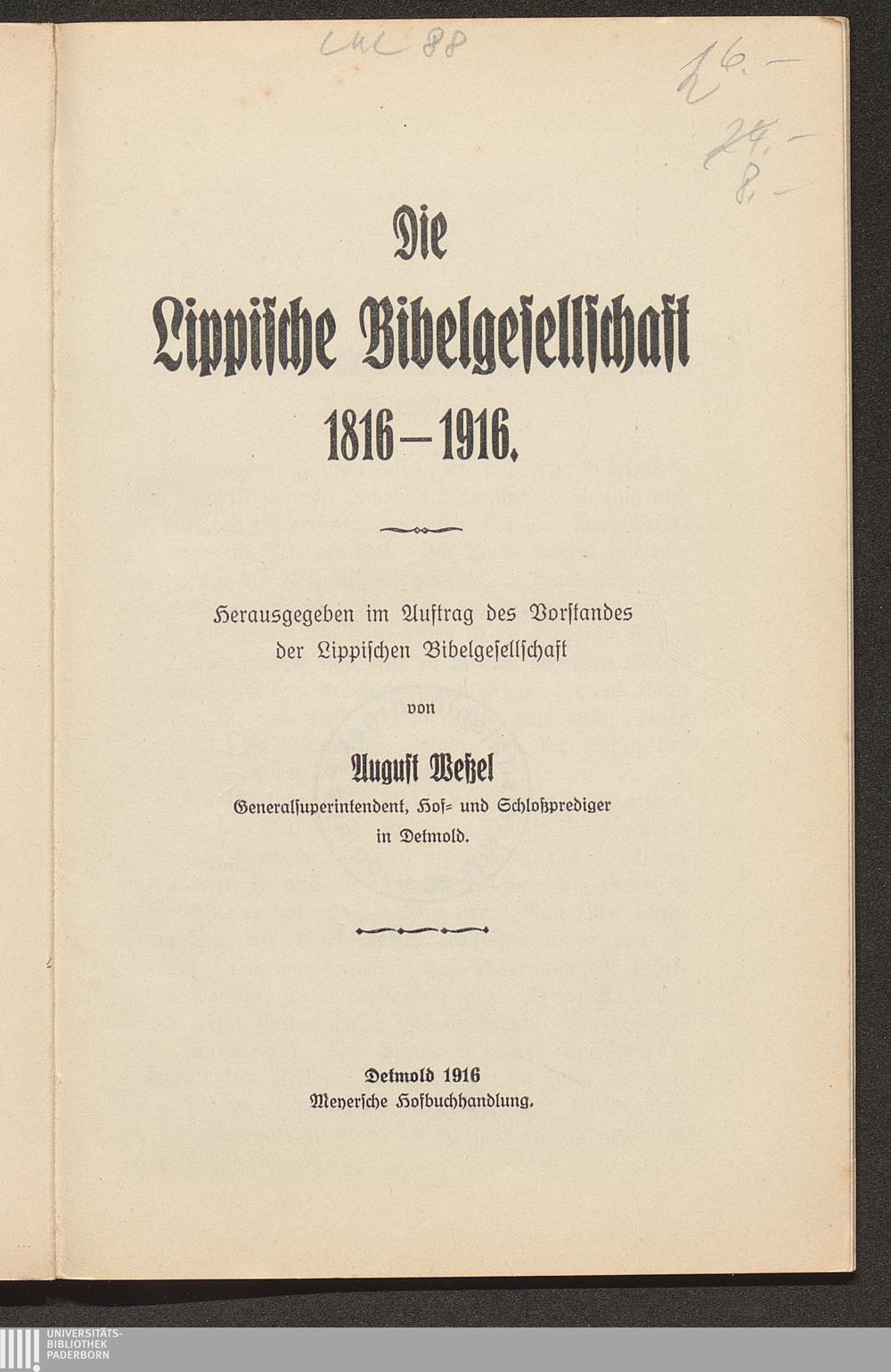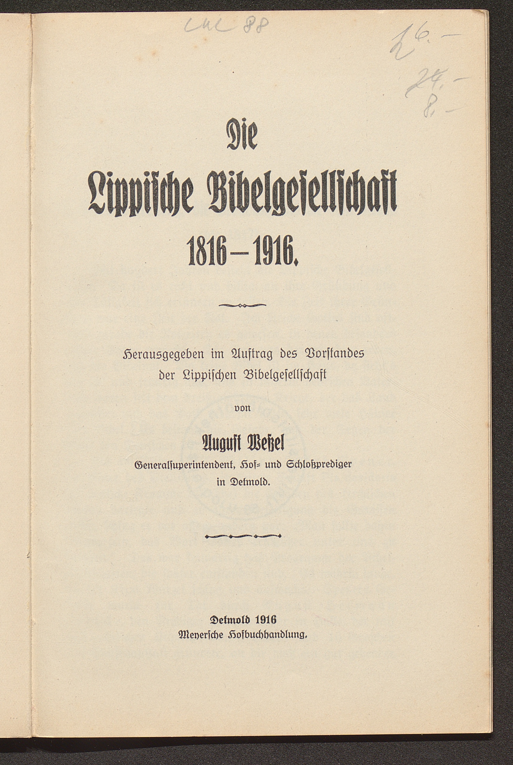Die Lippische Bibelgesellschaft 1816 - 1916 / hrsg. ... von August Wessel