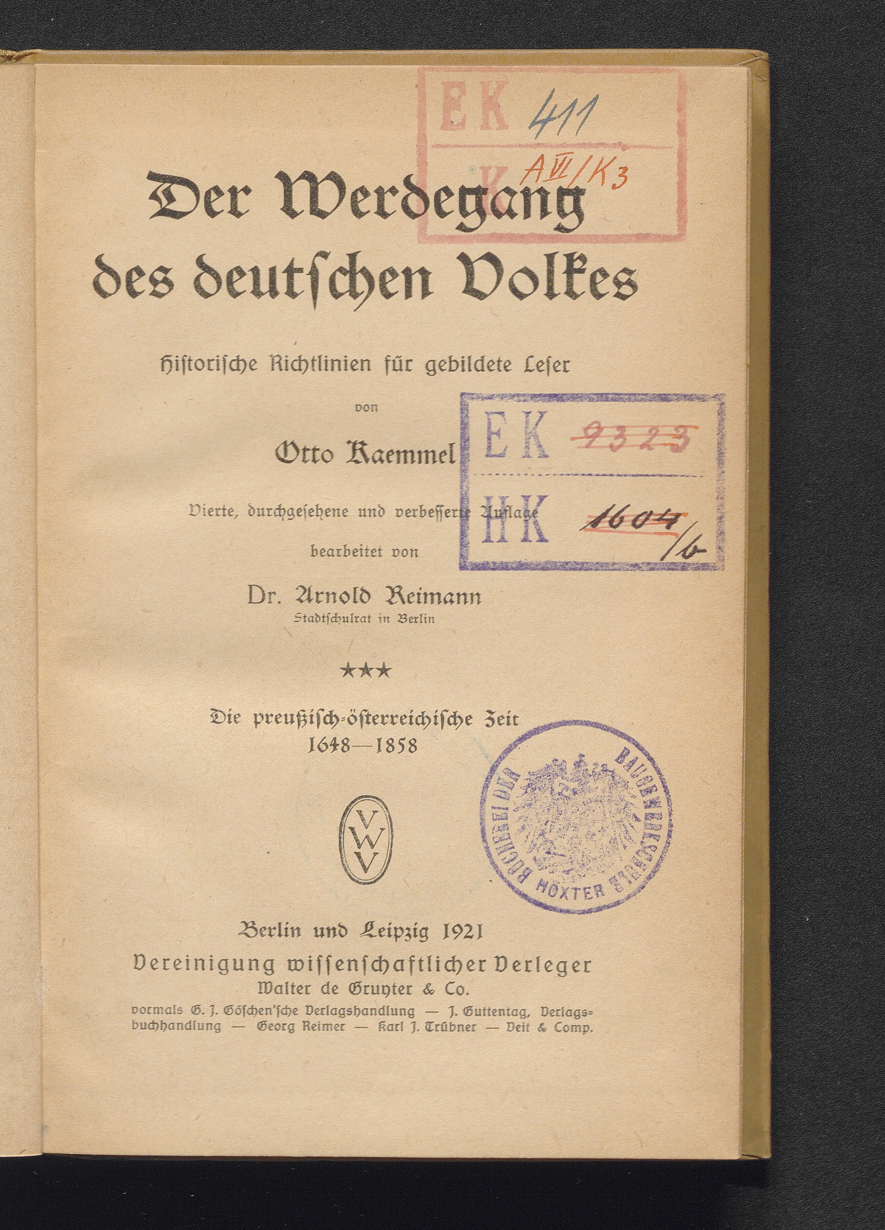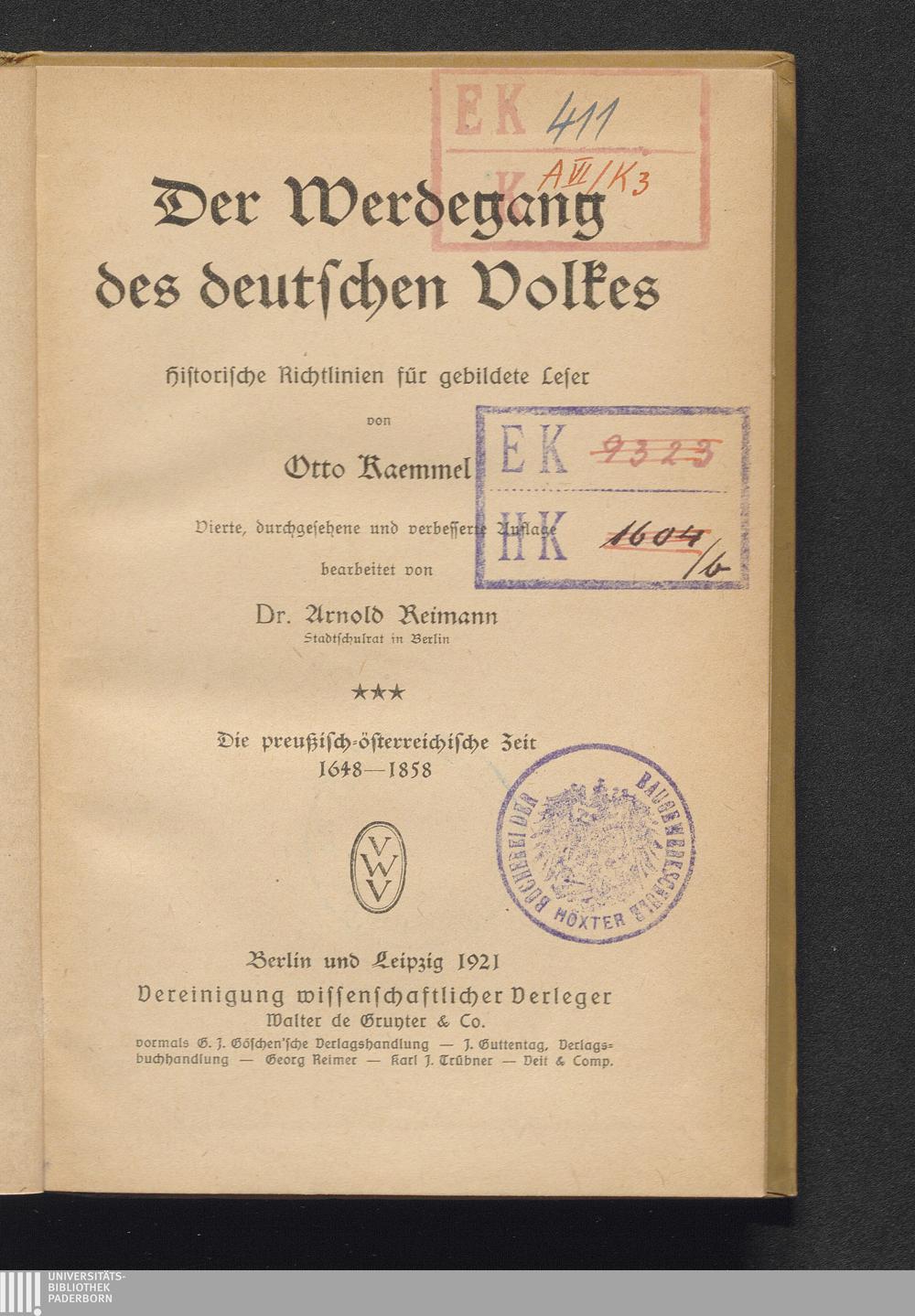 3 (1921) Der Werdegang des deutschen Volkes : historische Richtlinien für gebildete Leser / von Otto Kaemmel. Bearb. von Arnold Reimann. 3 / <<Die>> preussisch-österreichische Zeit 1648 - 1858