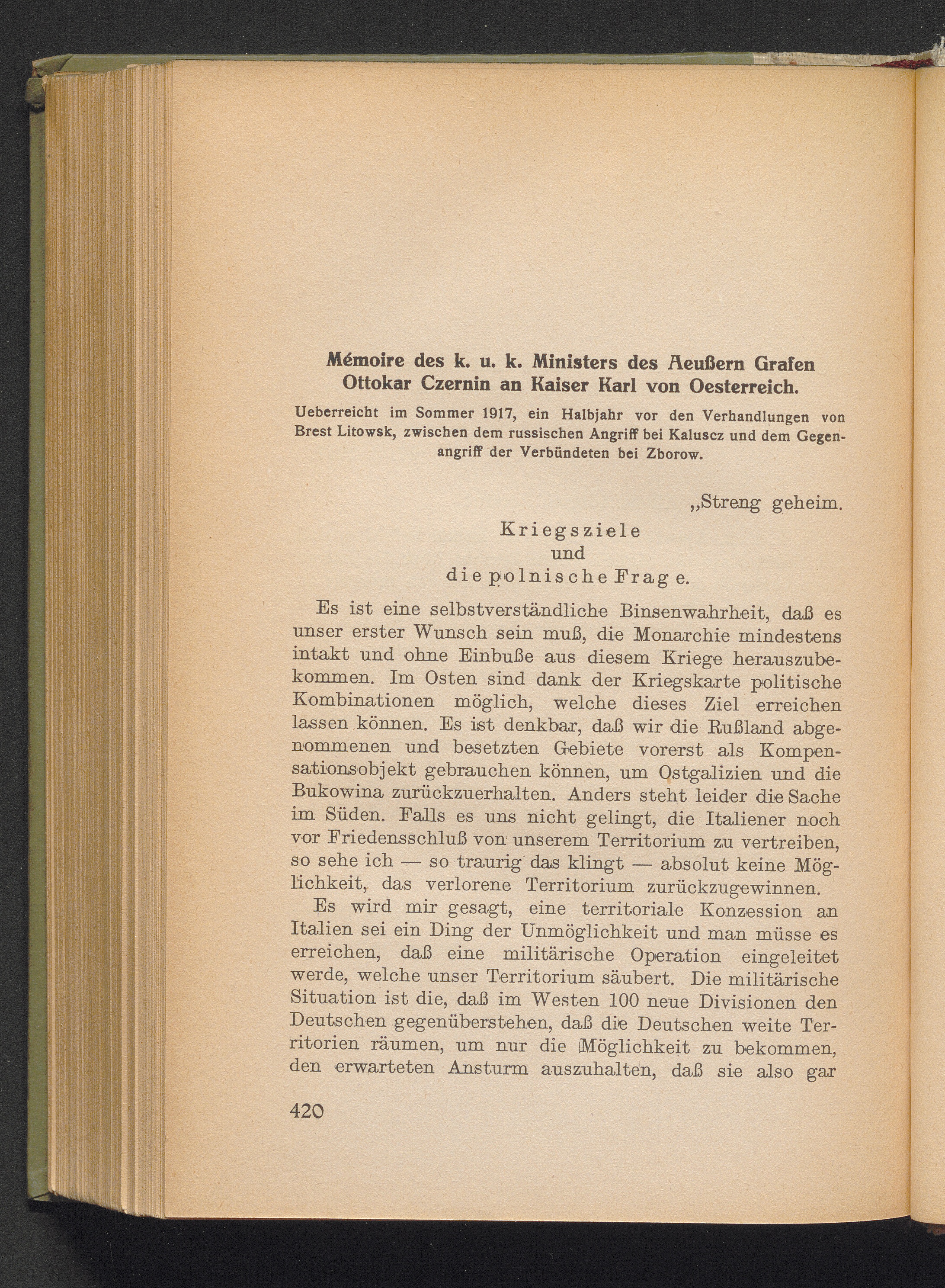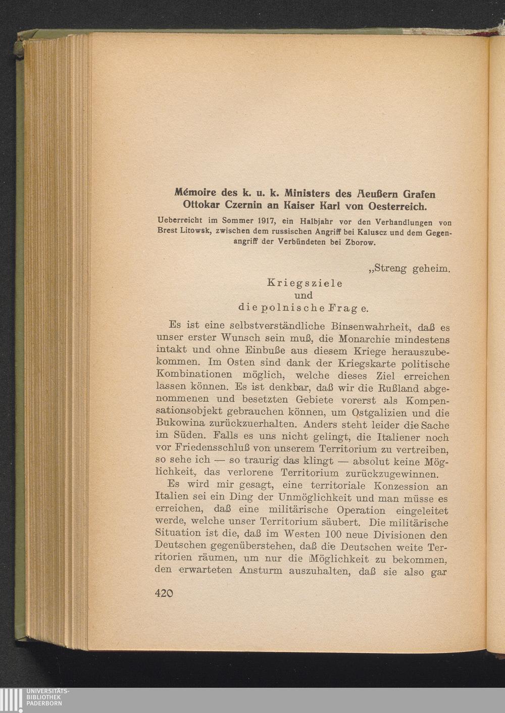 Mémoire des k. u. k. Ministers des Äußern Grafen Ottokar Czernin an Kaiser Karl von[...]