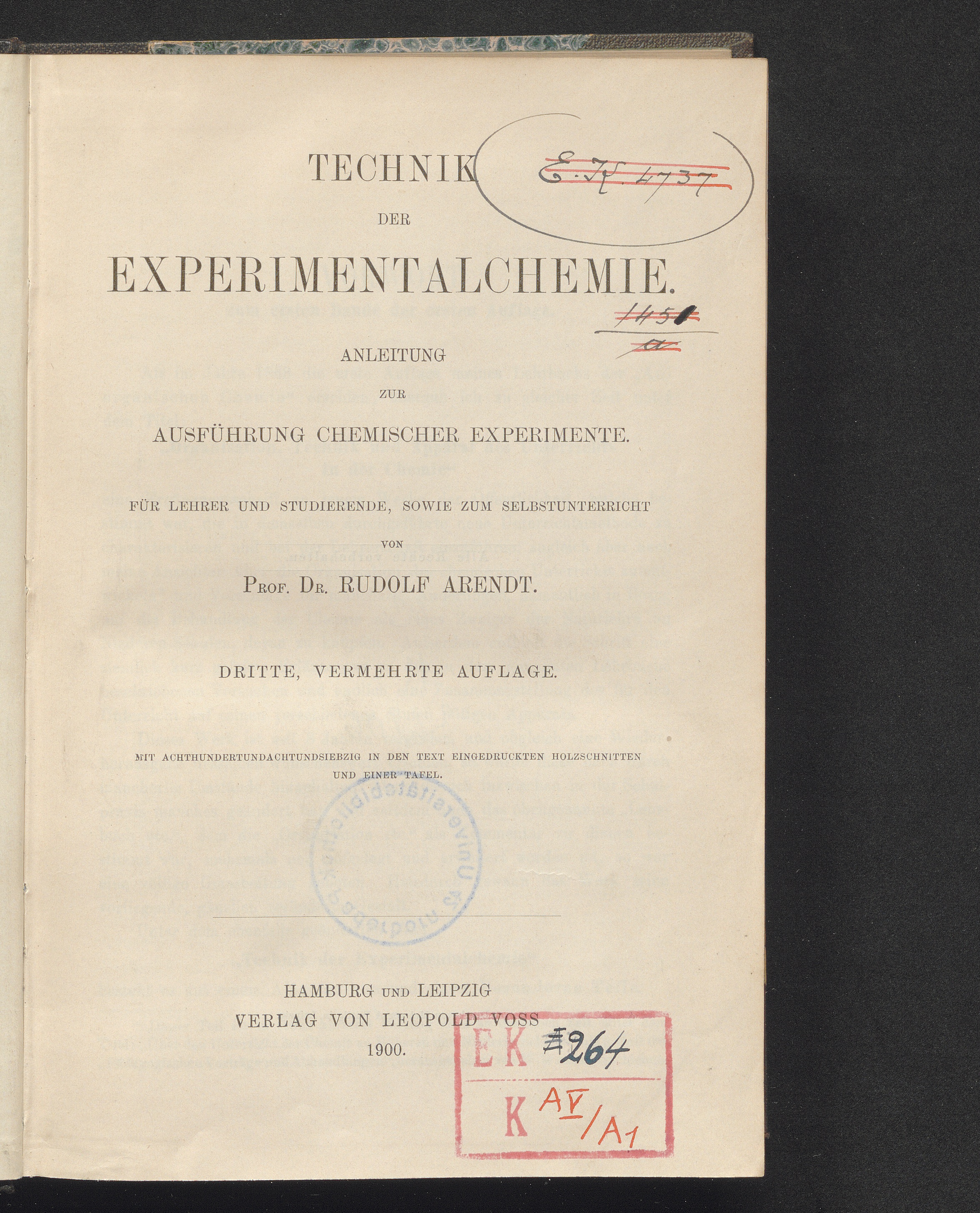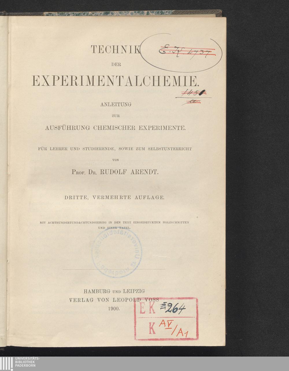 Technik der Experimentalchemie : Anleitung zur Ausführung chemischer Experimente für Lehrer und Studierende, sowie zum Selbststudium ; mit 878 in den Text eingedruckten Holzschnitten und einer Tafel / von Rudolf Arendt