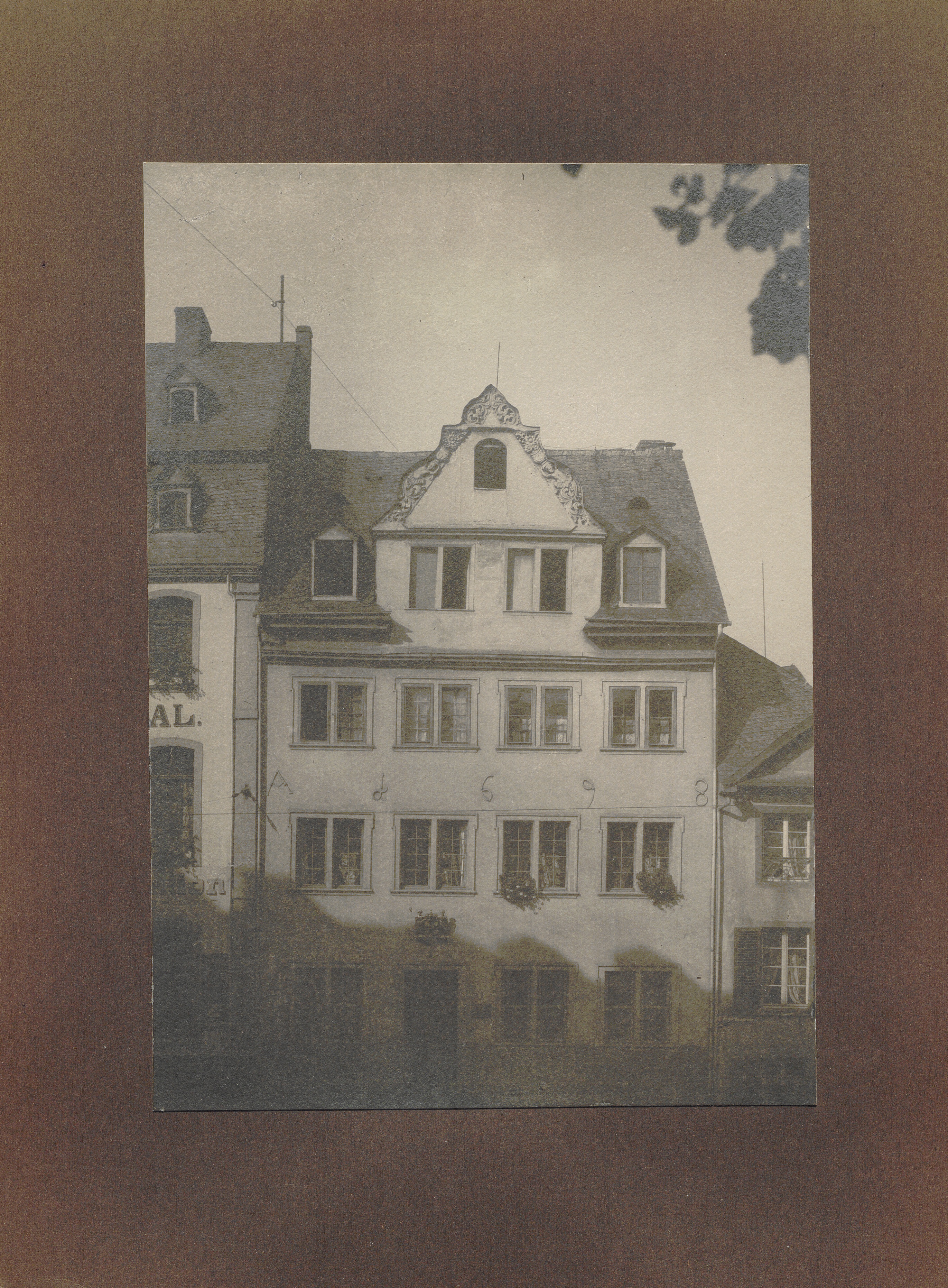 Coblenz, Altes Haus mit holzgeschnitztem Giebel an der Moselbrücke 4, 1698