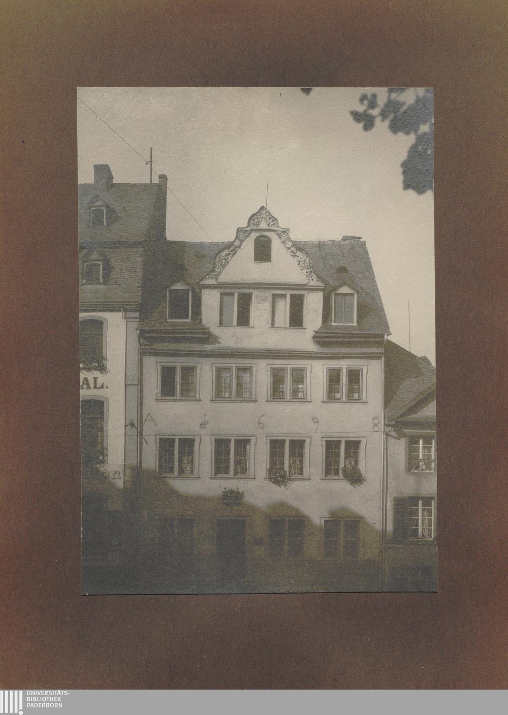 Coblenz, Altes Haus mit holzgeschnitztem Giebel an der Moselbrücke 4, 1698 / von Erwin Quedenfeldt
