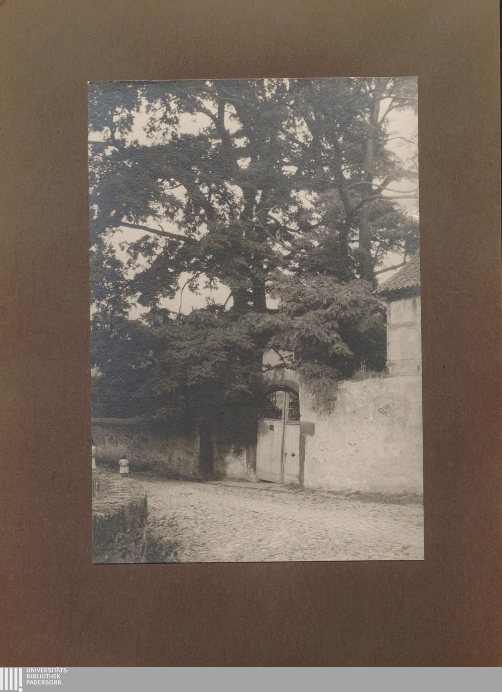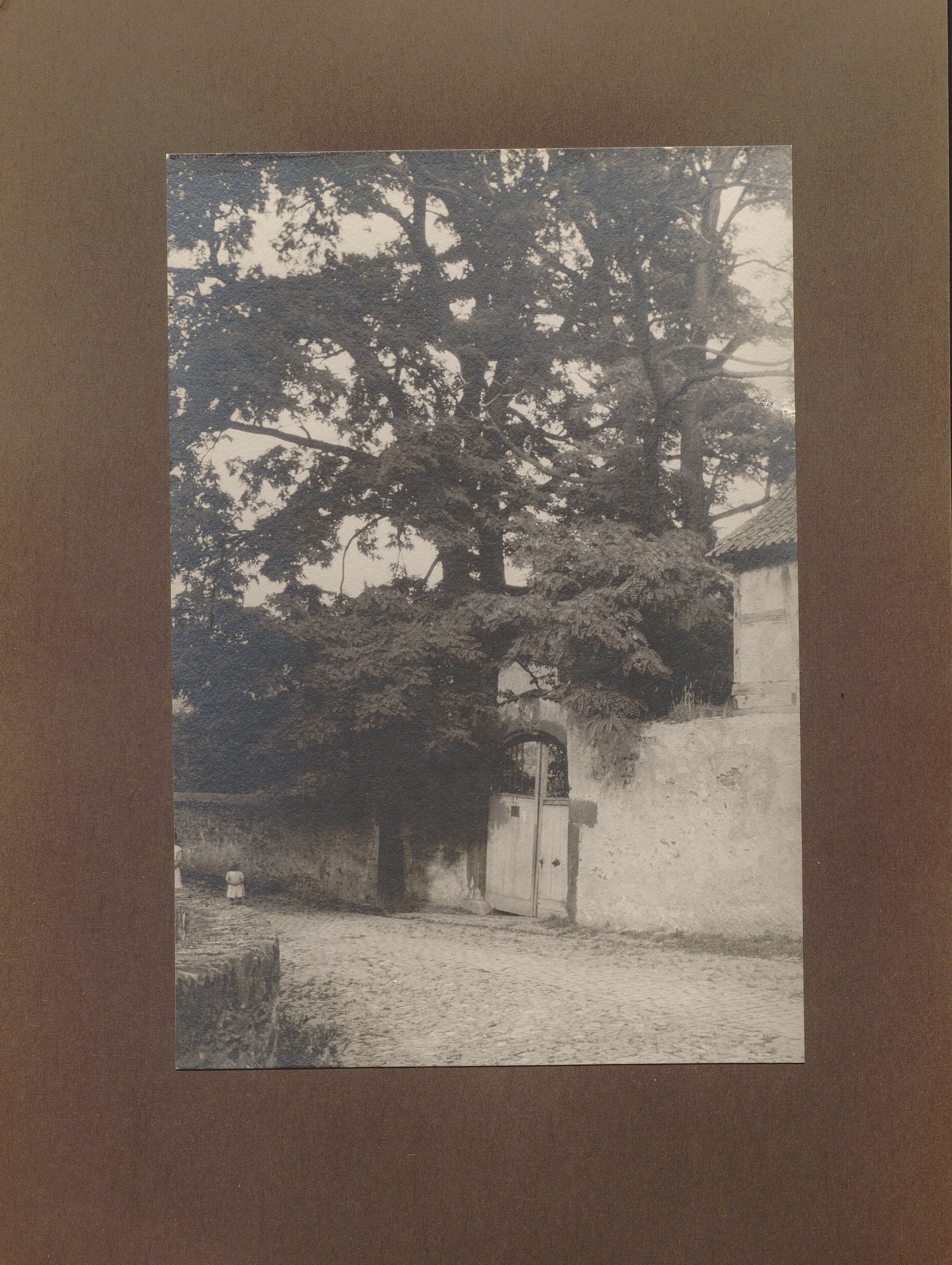 Rheinbreitbach, Tor mit alten Akazienbäumen an der unteren Burg / von Erwin Quedenfeldt