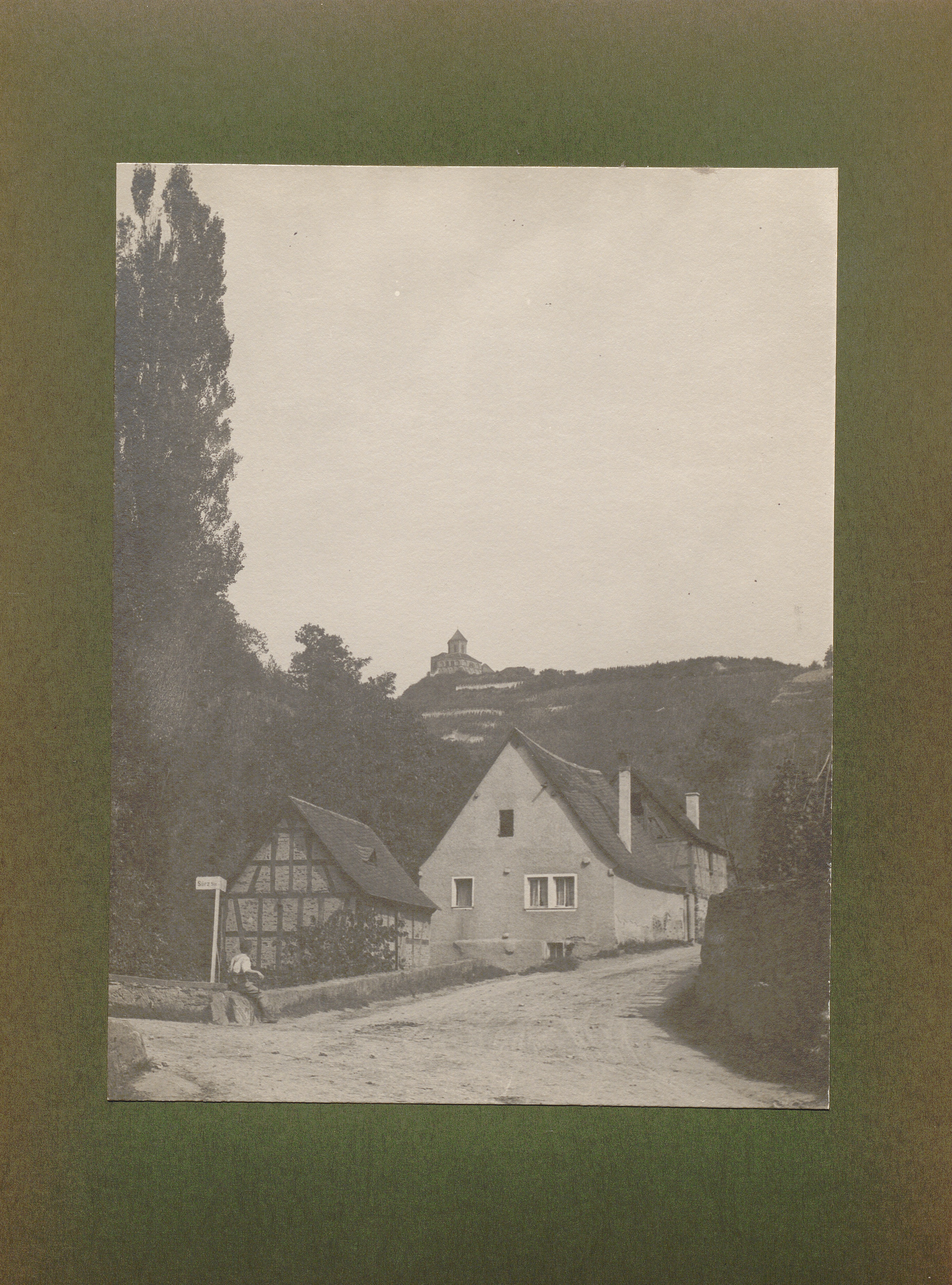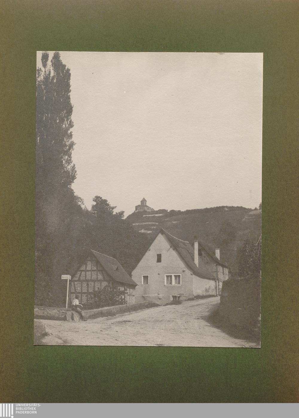 Cobern, Einfache Bauernhäuser mit hoher Pappel, Blick auf die Matthias-Kapelle auf dem Berge / von Erwin Quedenfeldt