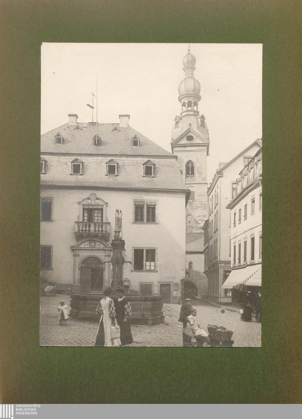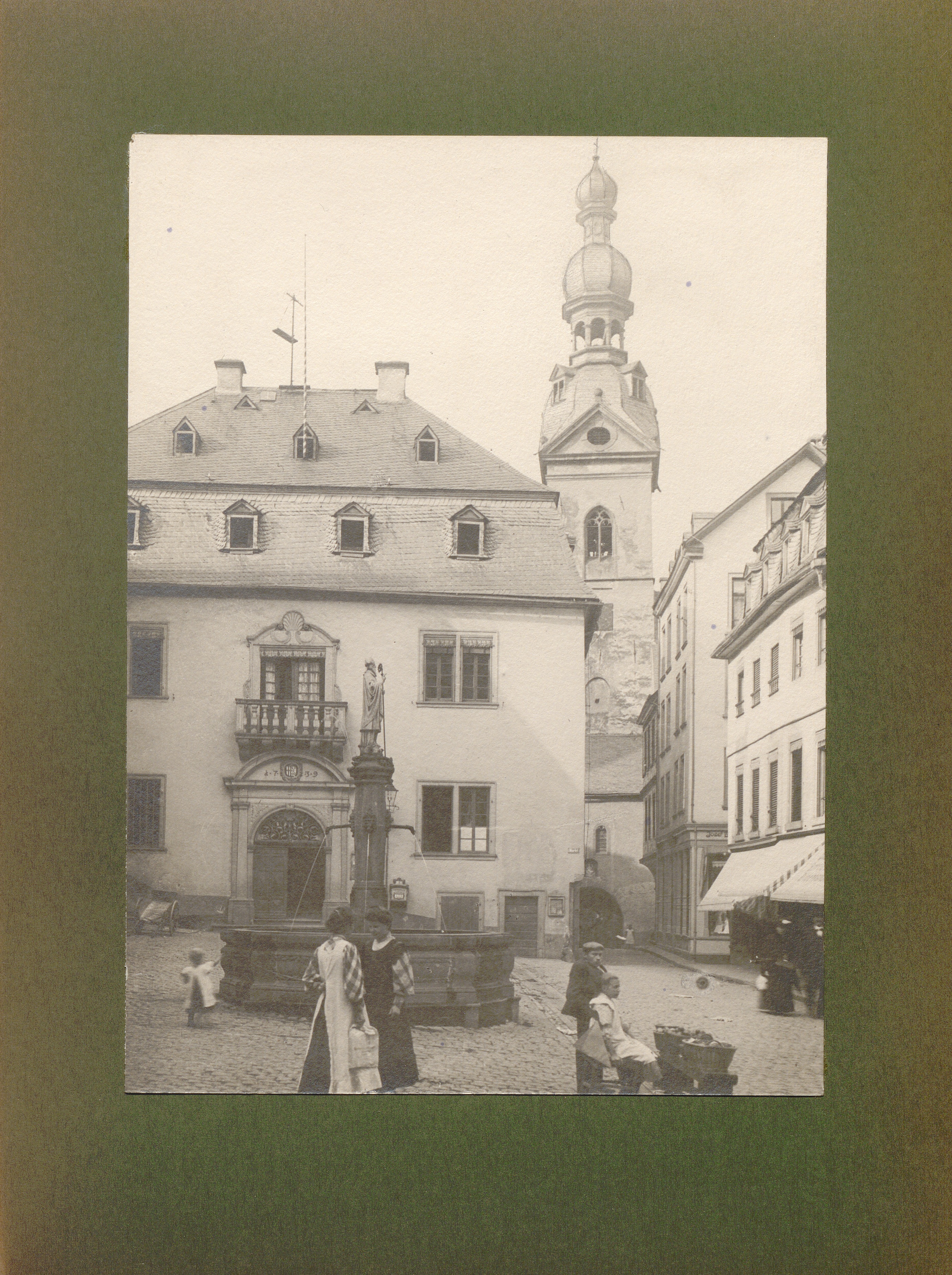 Cochem, Rathaus mit Brunnen und Kirchturm / von Erwin Quedenfeldt