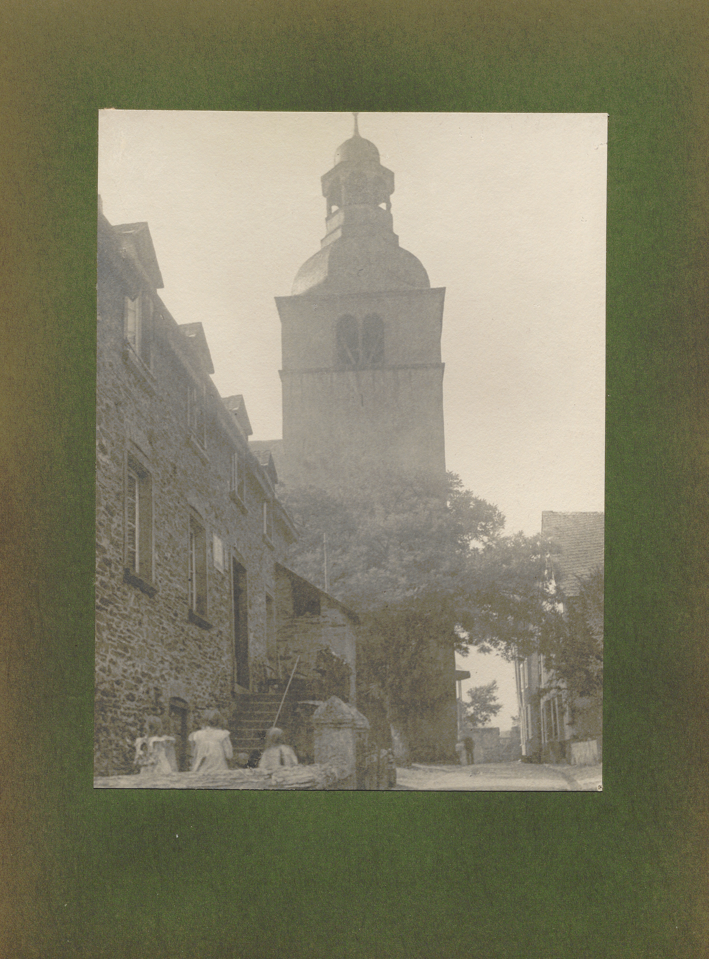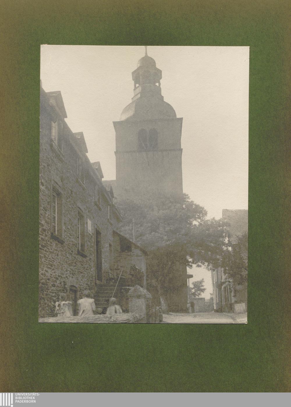Carden, Turm der Klosterkirche mit alten Häusern und altem Baum / von Erwin Quedenfeldt