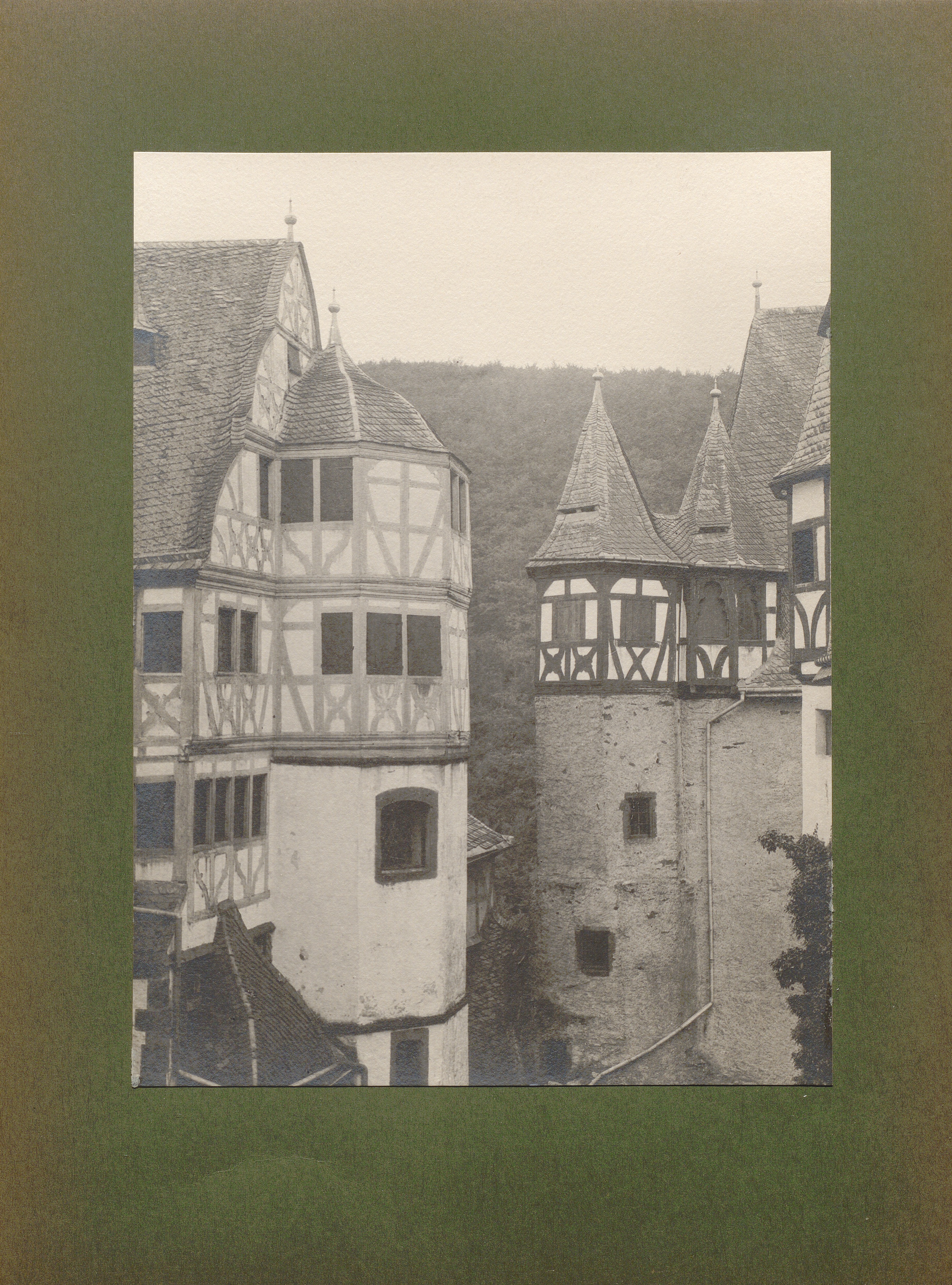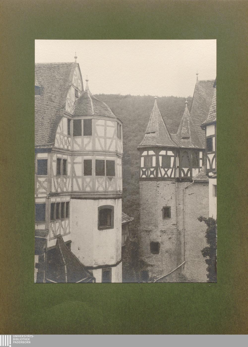 Eltz, Burg, Giebel des Kempenich, vom oberen Stockwerk aus gesehen, mit Seitentürmchen / von Erwin Quedenfeldt