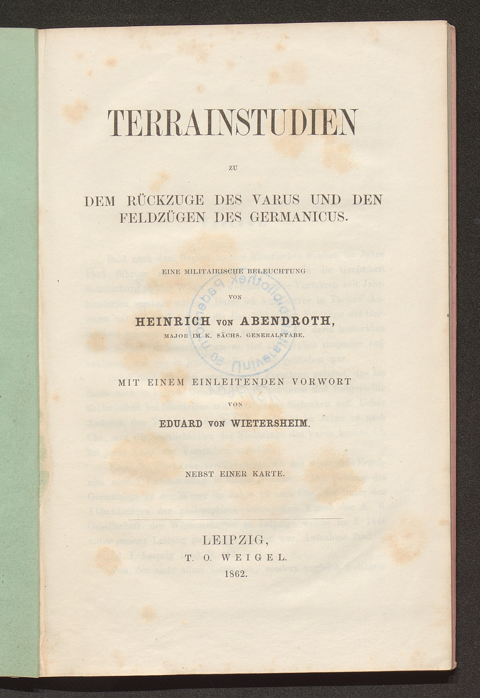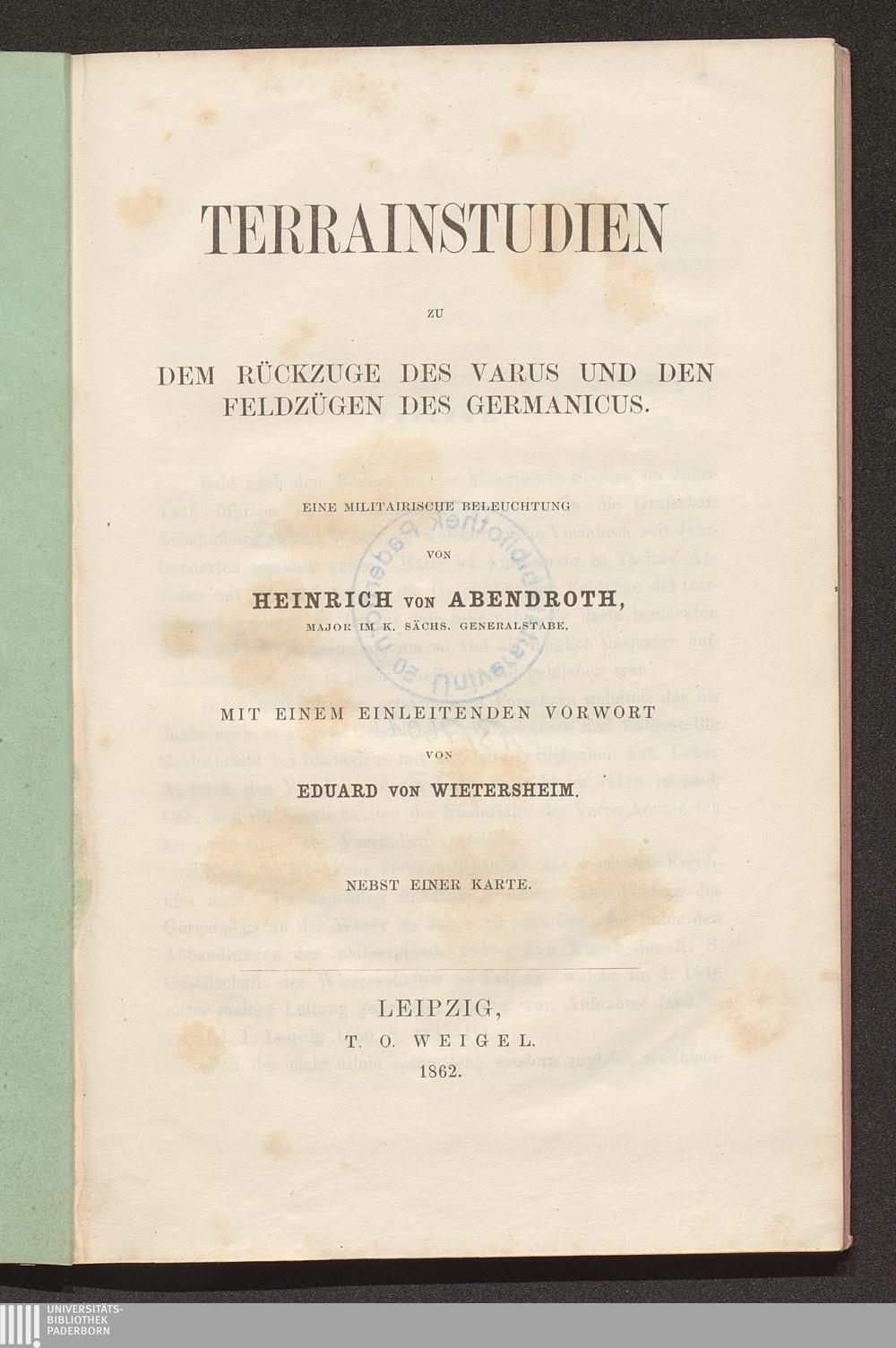 Terrainstudien zu dem Rückzuge des Varus und den Feldzügen des Germanicus : eine militärische Beleuchtung ; nebst einer Karte / von Heinrich von Abendroth. Mit einem einleitenden Vorwort von Eduard von Wietersheim