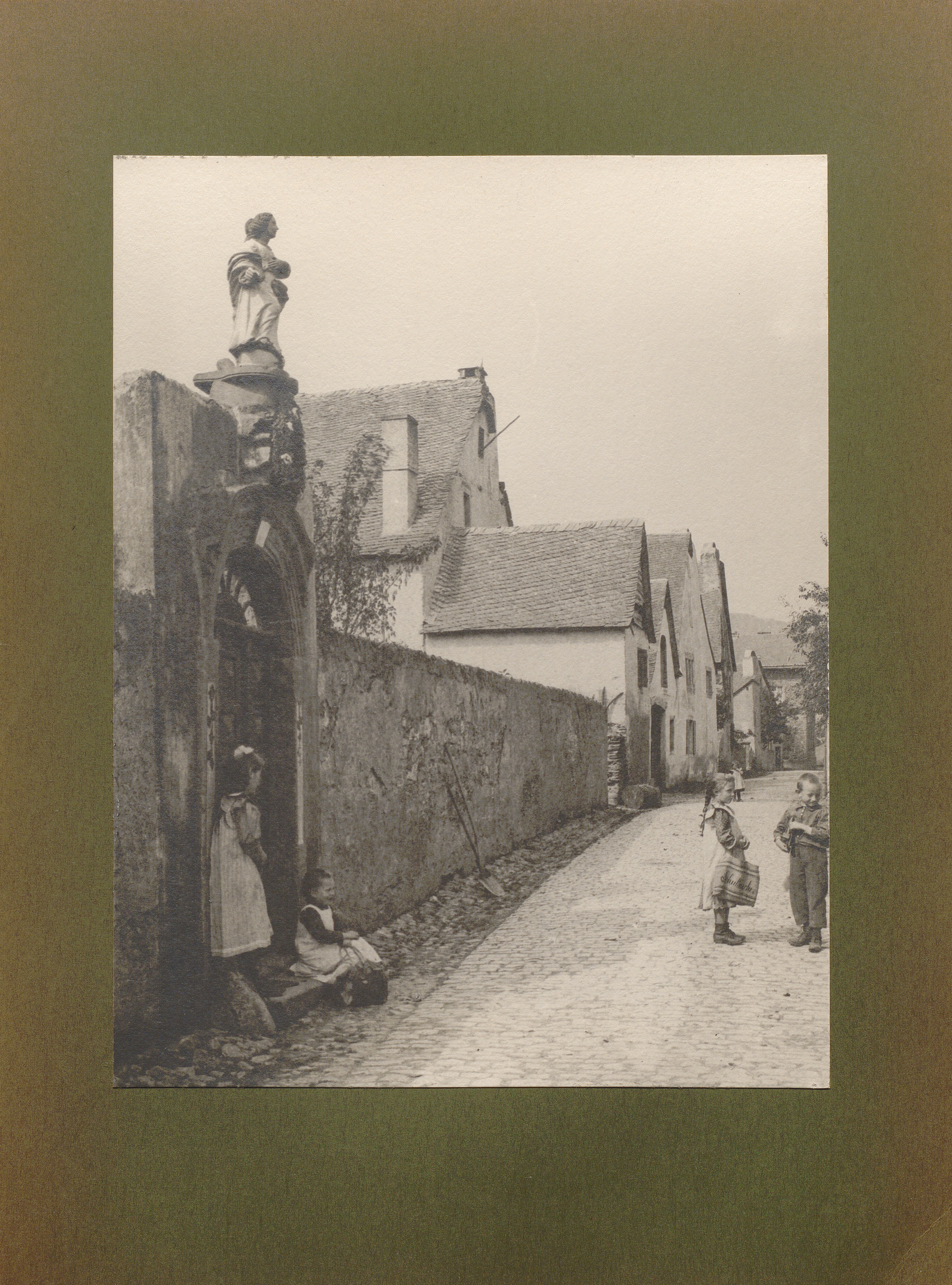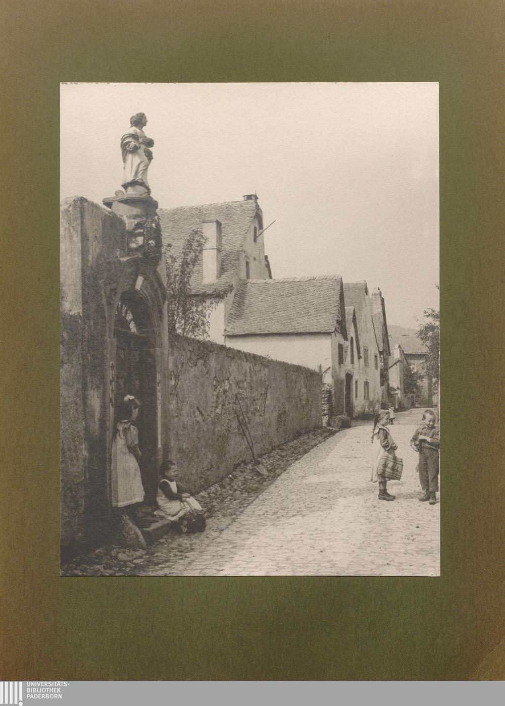 Rachtig, Gartenmauerportal mit Heiligenfigur und alten Häusern / von Erwin Quedenfeldt