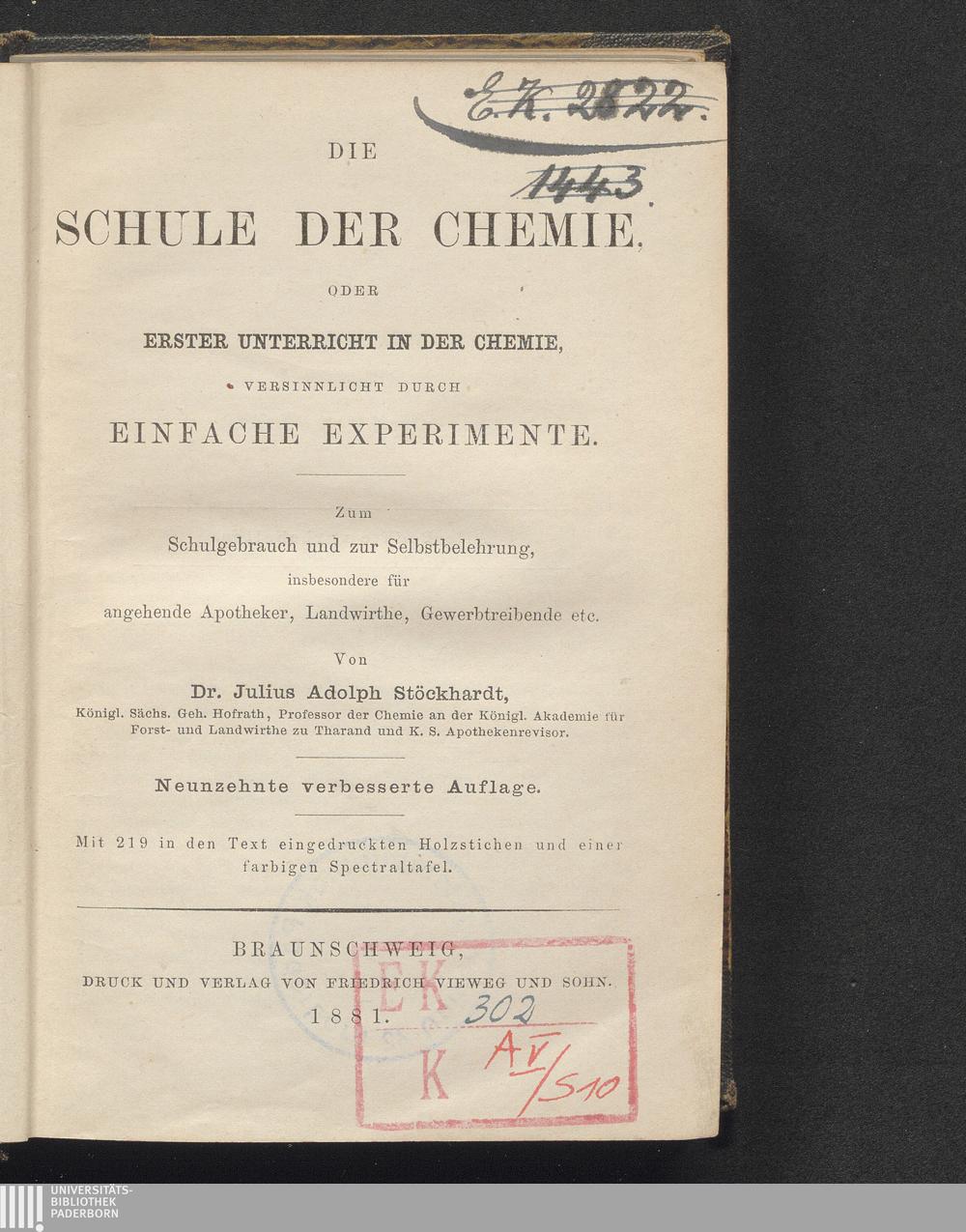 Die Schule der Chemie, oder erster Unterricht in der Chemie : versinnlicht durch einfache Experimente ; zum Schulgebrauch und zur Selbstbelehrung, insbesondere für angehende Apotheker, Landwirthe, Gewerbetreibende etc / von Julius Adolph Stöckhardt
