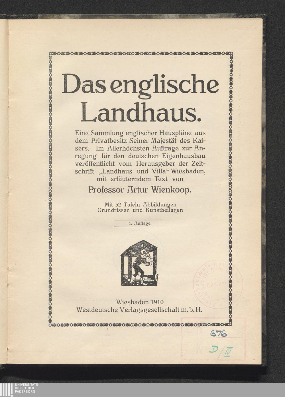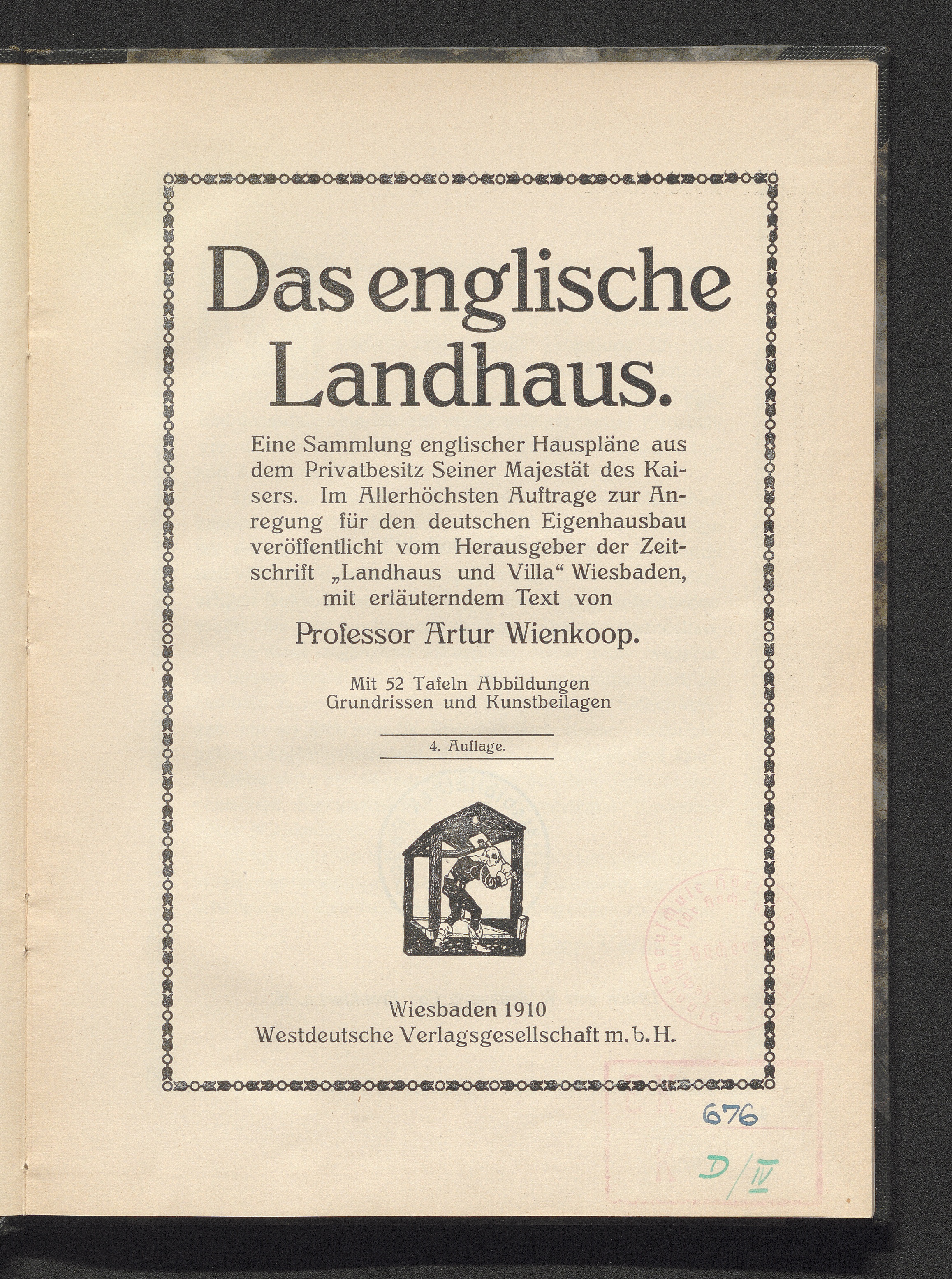 Das englische Landhaus : eine Sammlung englischer Hauspläne aus dem Privatbesitz Seiner Majestät des Kaisers / im allerhöchstem Auftrage zur Anregung für den deutschen Eigenhausbau veröffentlicht vom Herausgeber der Zeitschrift "Landhaus und Villa" Wiesbaden, mit erläuterndem Text von Artur Wienkoop