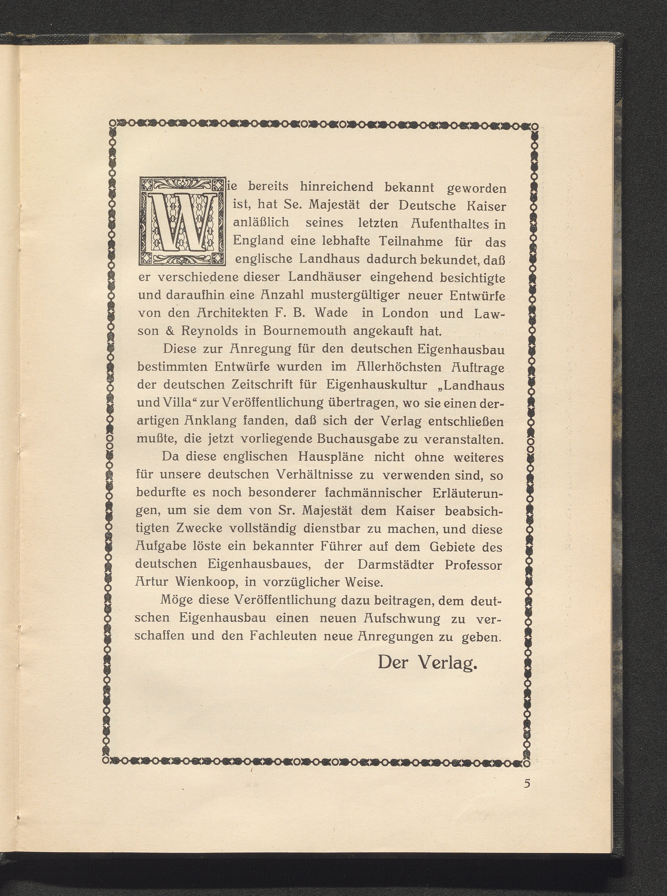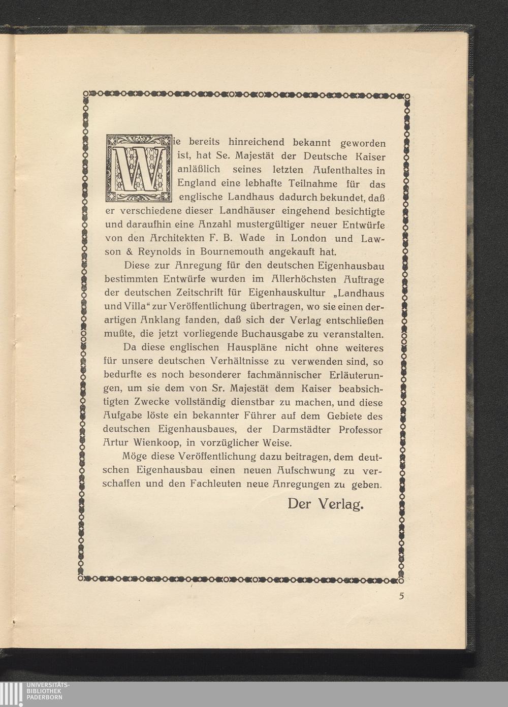 Das englische Landhaus : eine Sammlung englischer Hauspläne aus dem Privatbesitz Seiner Majestät des Kaisers / im allerhöchstem Auftrage zur Anregung für den deutschen Eigenhausbau veröffentlicht vom Herausgeber der Zeitschrift "Landhaus und Villa" Wiesbaden, mit erläuterndem Text von Artur Wienkoop