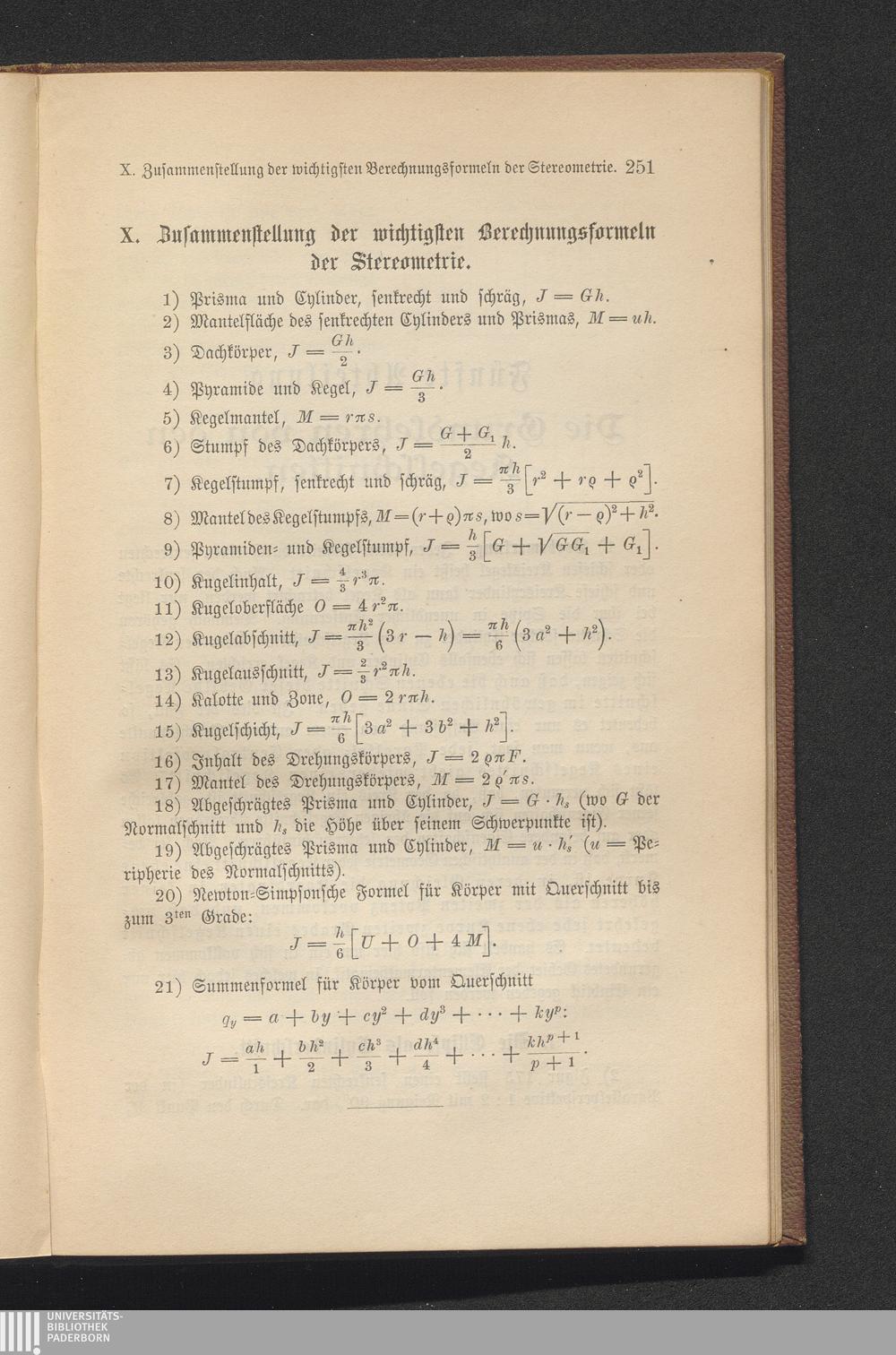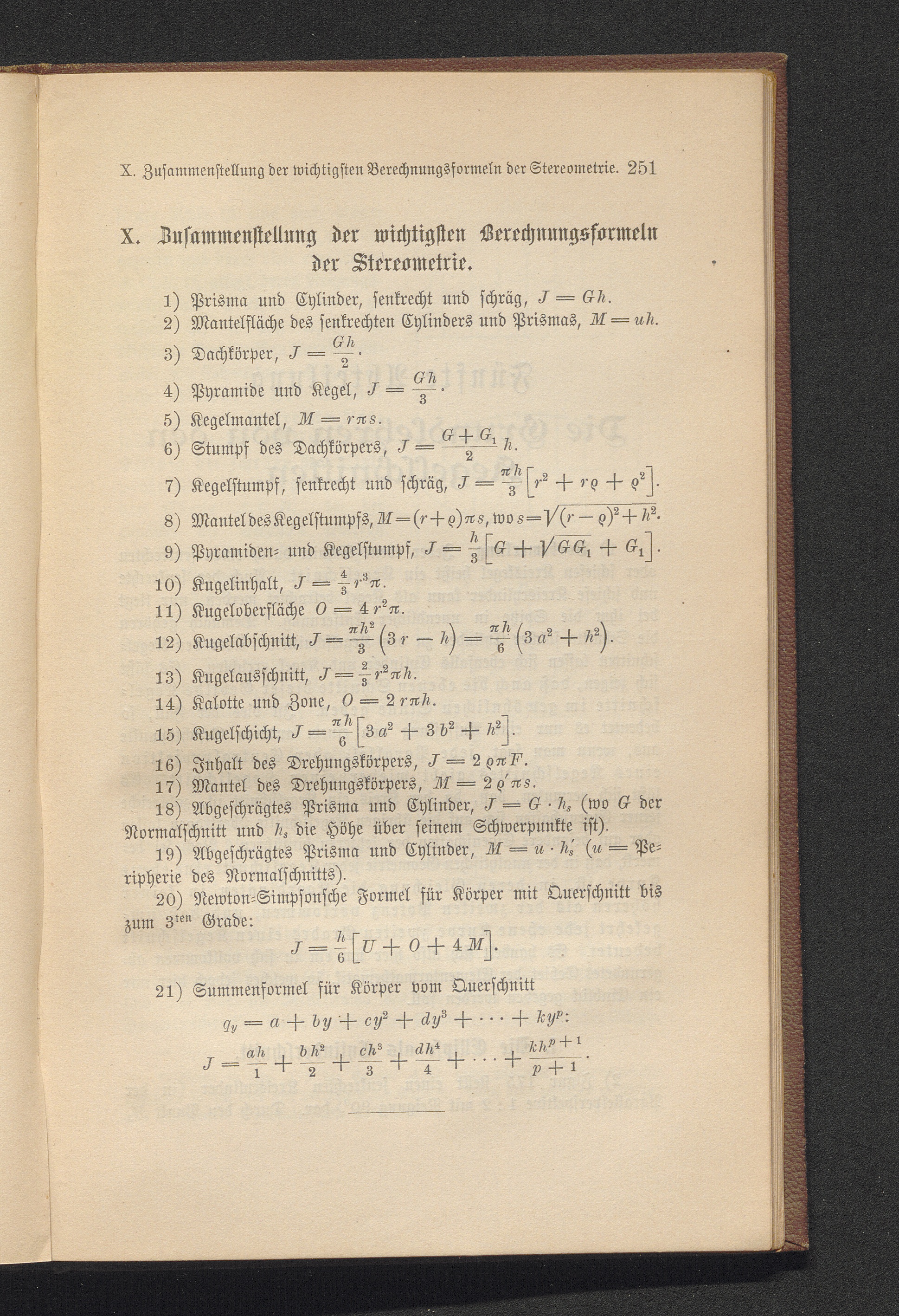 X. Zusammenstellung der wichtigsten Berechnungsformeln der Stereometrie.