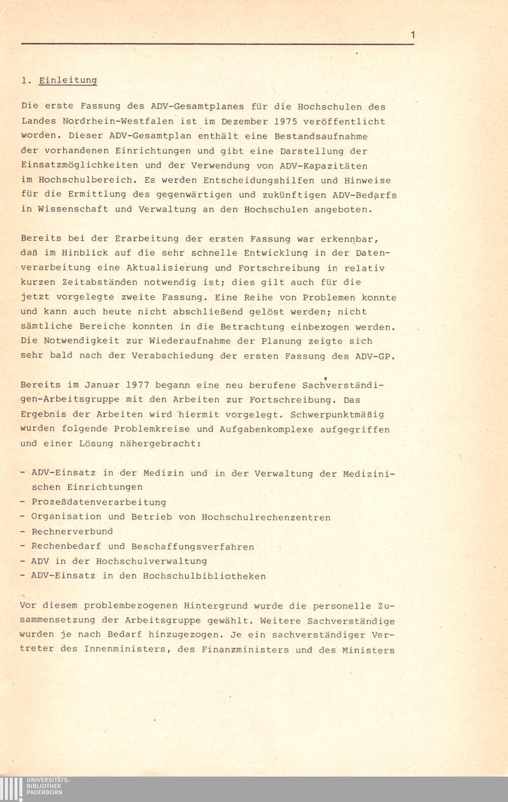 ADV-Gesamtplan für die Hochschulen des Landes Nordrhein-Westfalen : (ADVGP-HS) ; Empfehlungen der Sachverständigen-Arbeitsgruppe beim Minister für Wissenschaft und Forschung des Landes Nordrhein-Westfalen / vorgelegt von der Sachverständigen-Arbeitsgruppe für die Erstellung eines Gesamtplanes für die Automatisierte Datenverarbeitung an den Hochschulen des Landes Nordrhein-Westfalen