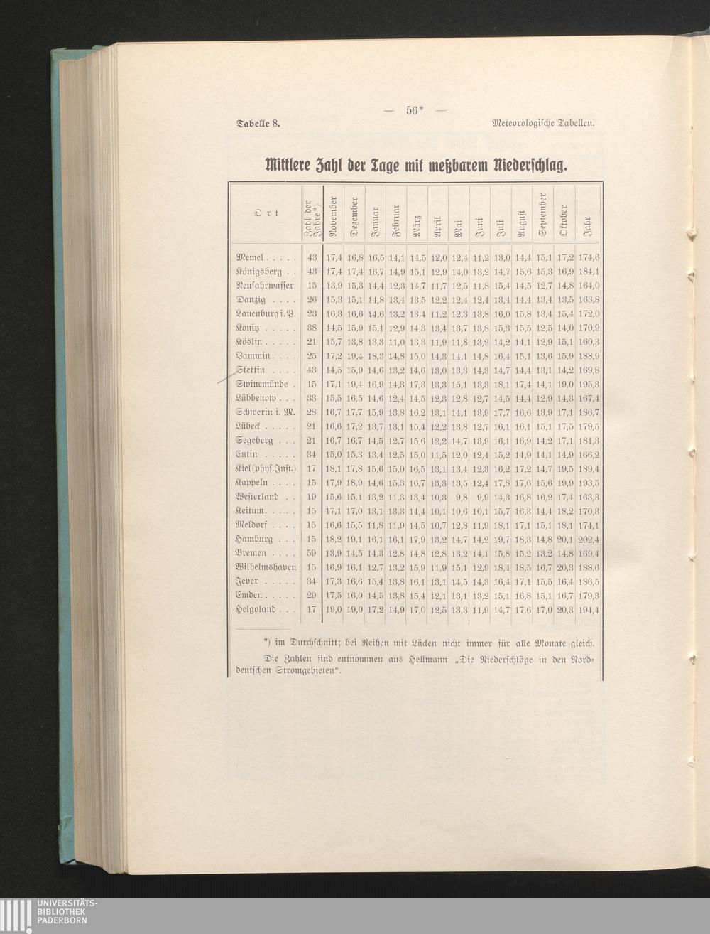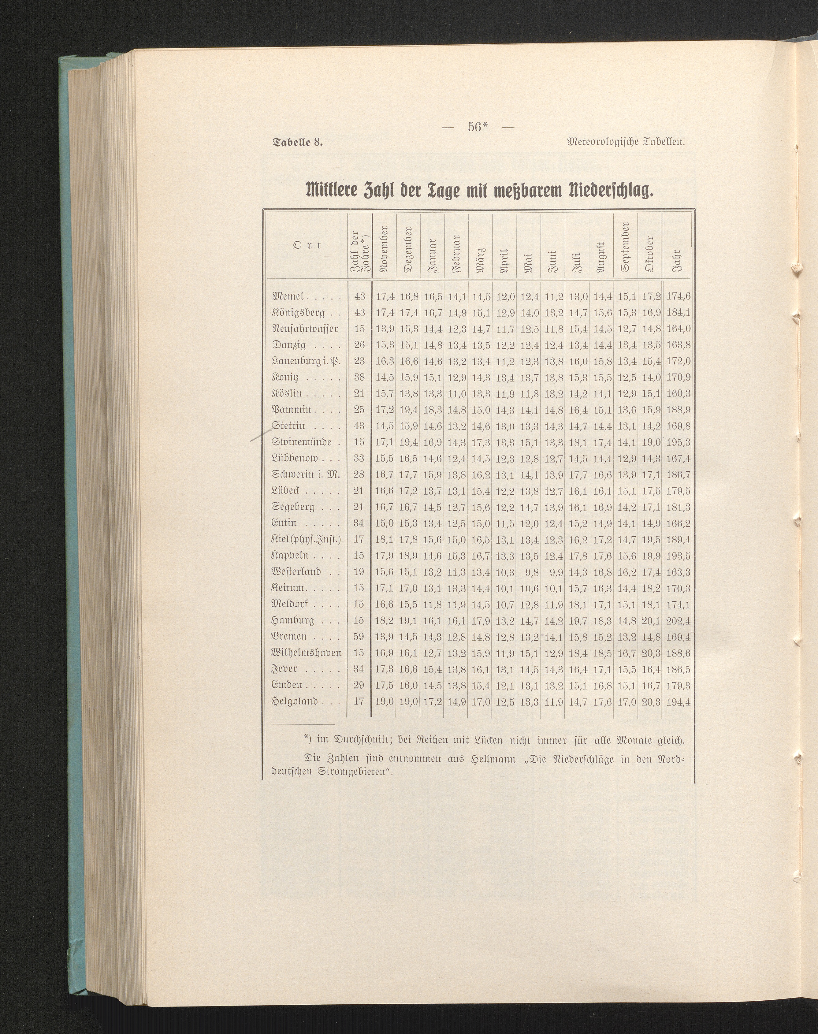 Tab. 8. Mittlere Zahl der Tage mit meßbarem Niederschlag
