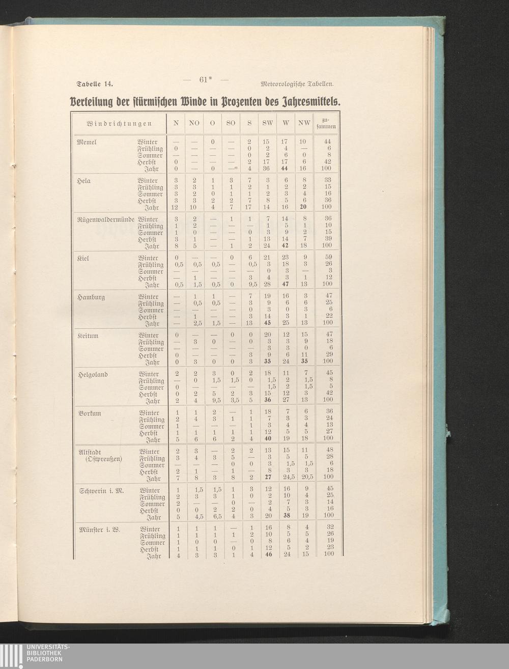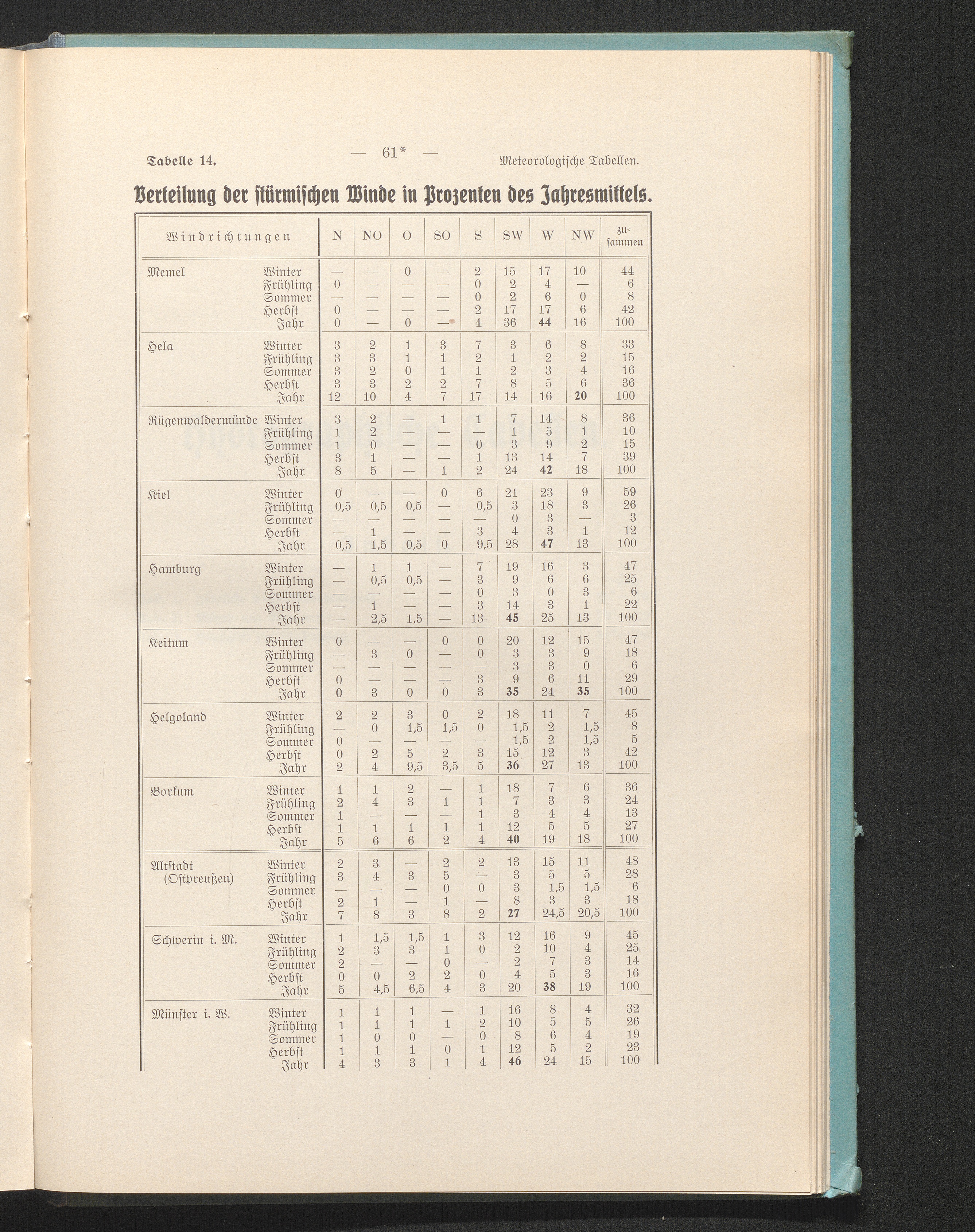 Tab. 14. Verteilung der stürmischen Winde in Prozenten des Jahresmittels