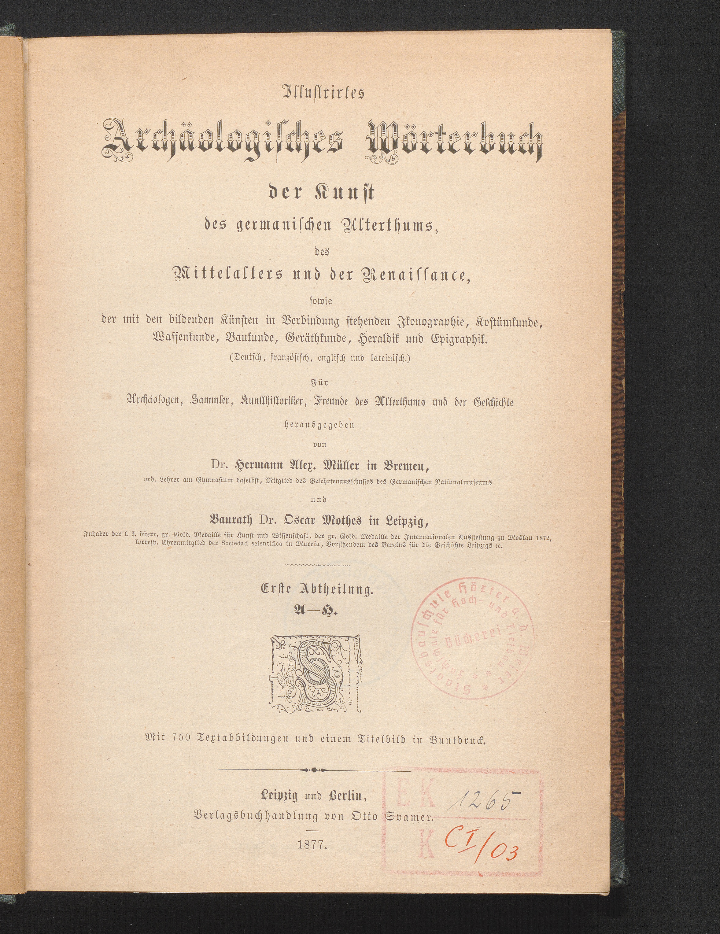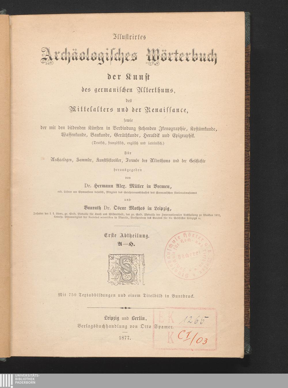 1 (1877) A - H : mit 750 Textabbildungen und einem Titelbild in Buntdruck / herausgegeben von Dr. Hermann Alex. Müller in Bremen, ord. Lehrer am Gymnasium daselbst, Mitglied des Gelehrtenausschusses des Germanischen Nationalmuseums und Baurath Dr. Oscar Mothes in Leipzig, Inhaber der k.k. österr. gr. Gold. Medaille für Kunst und Wissenschaft, der gr. Gold. Medaille der Internationalen Ausstellung zu Moskau 1872, korresp. Ehrenmitglied der Sociedad scientifica in Murcia, Vorsitzendem des Vereins für die Geschichte Leipzigs &c.