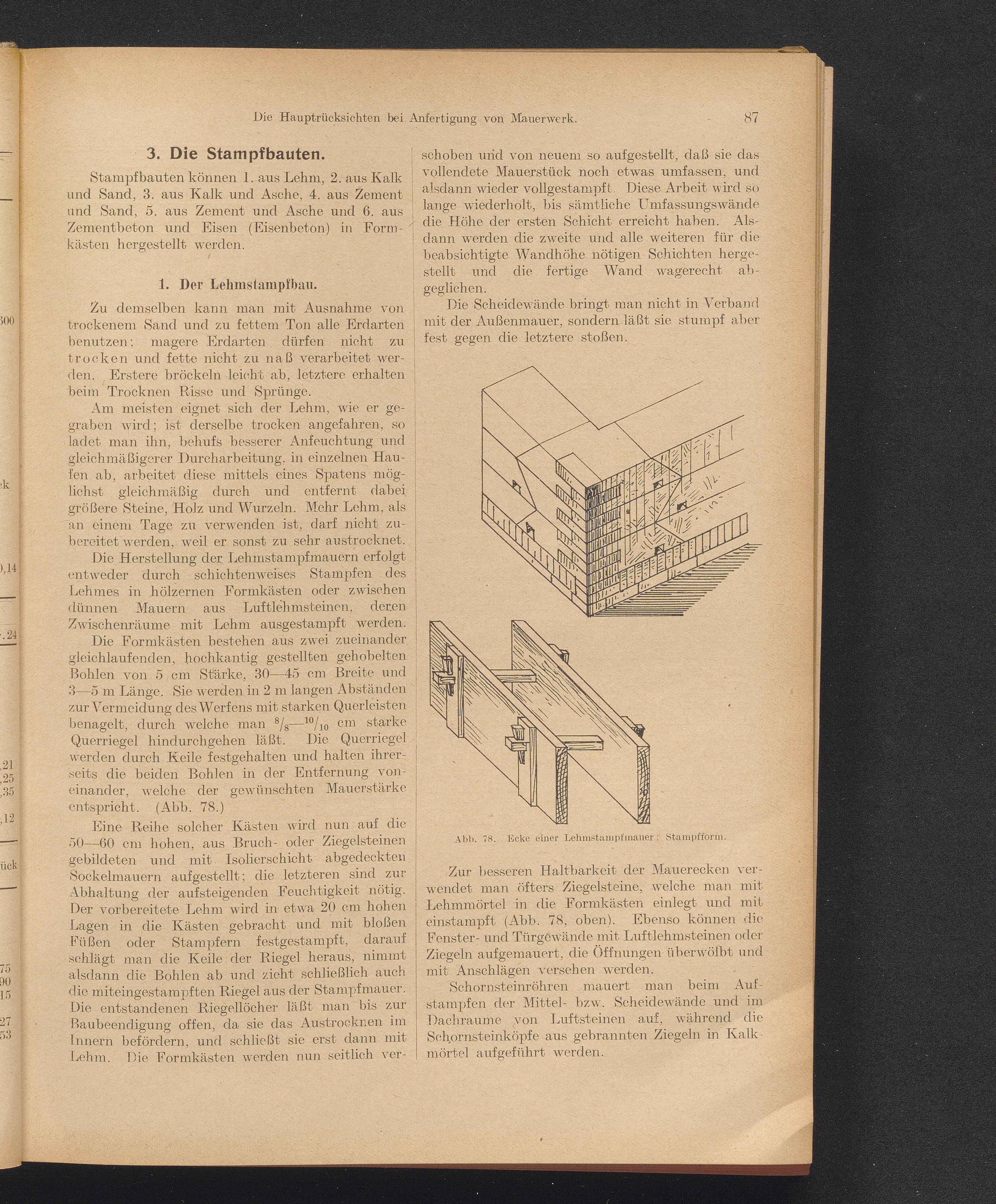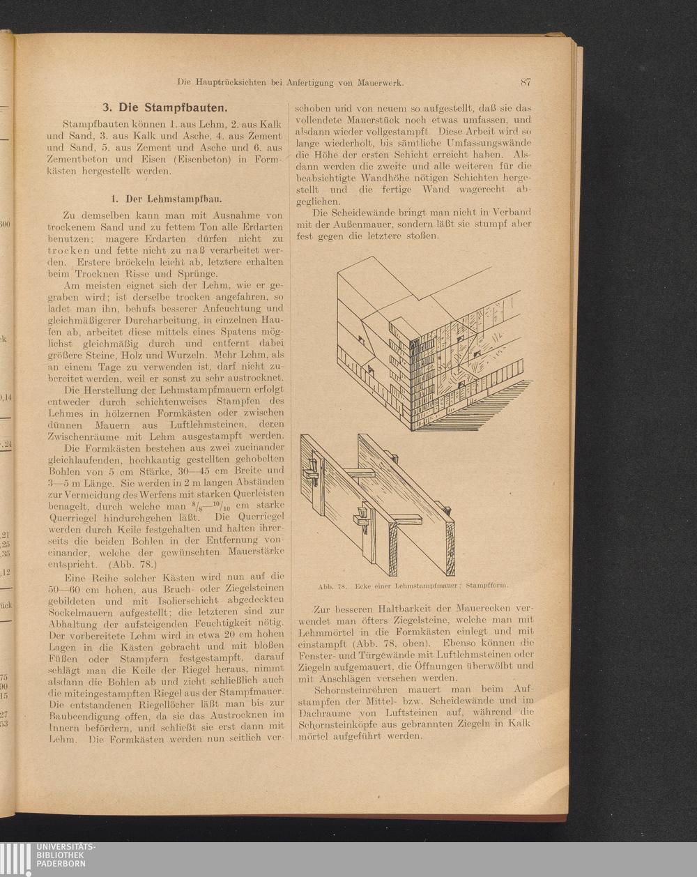 3. Die Stampfbauten: 1. Der Lehmstampfbau, Lehmdrahtwände, 2. Der Kalksandstampfbau.[...]