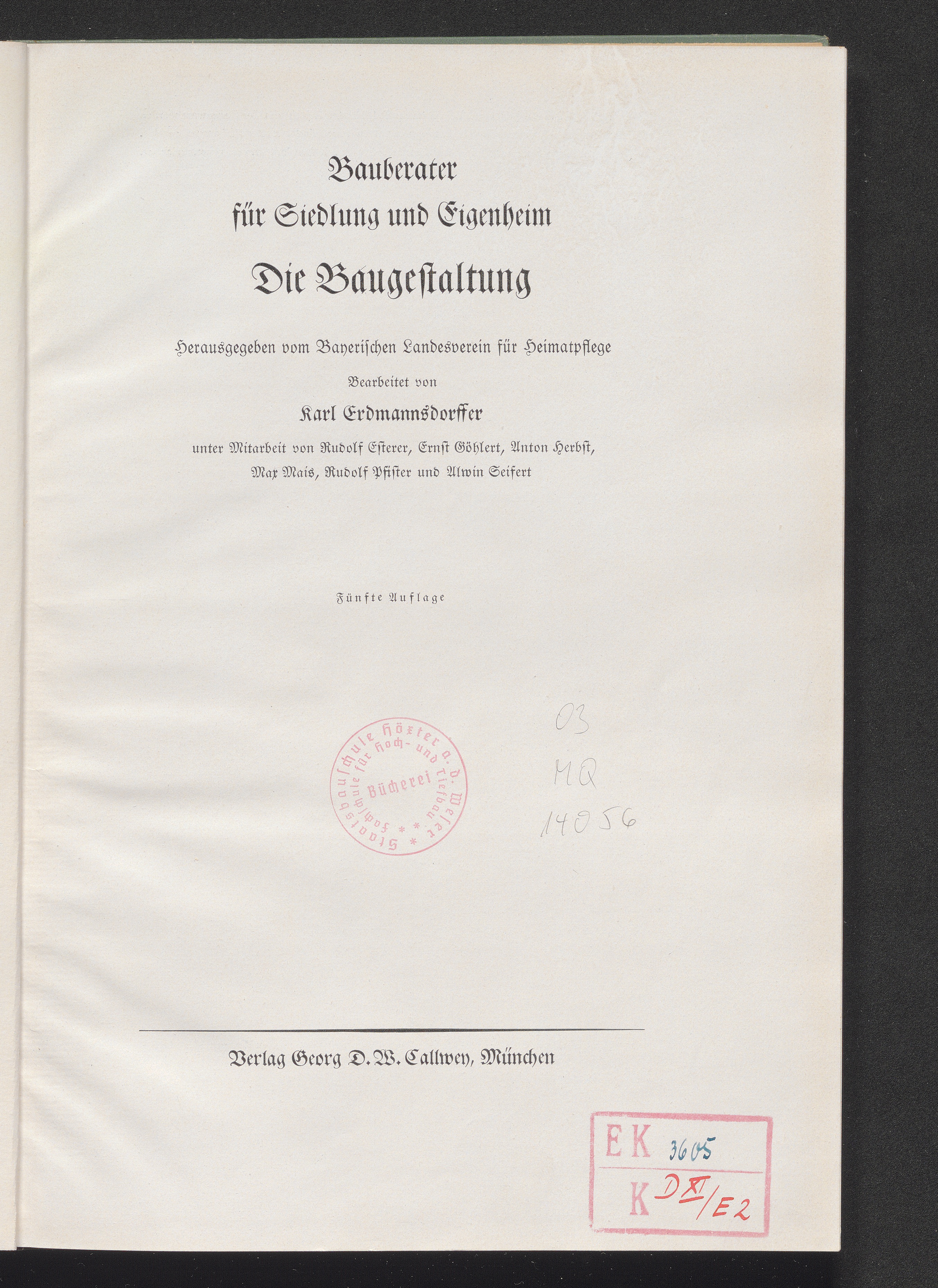 Die Baugestaltung : Bauberater für Siedlung und Eigenheim / herausgegeben vom Bayerischen Landesverein für Heimatpflege. Bearbeitet von Karl Erdmannsdorfer unter Mitarbeit von Rudolf Esterer ...