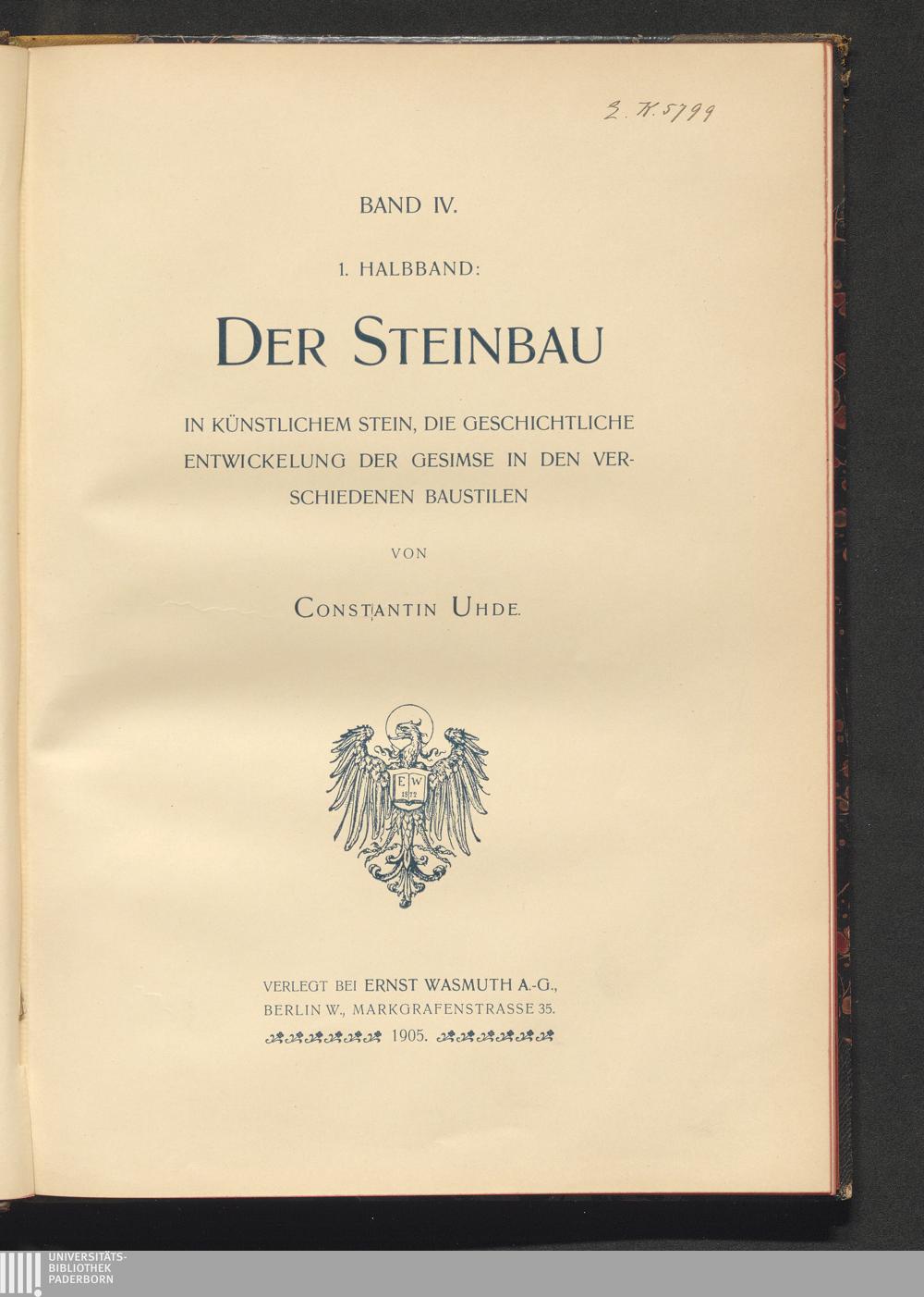 Der Steinbau in künstlichem Stein : die geschichtliche Entwickelung der Gesimse in den verschiedenen Baustilen / von Constantin Uhde