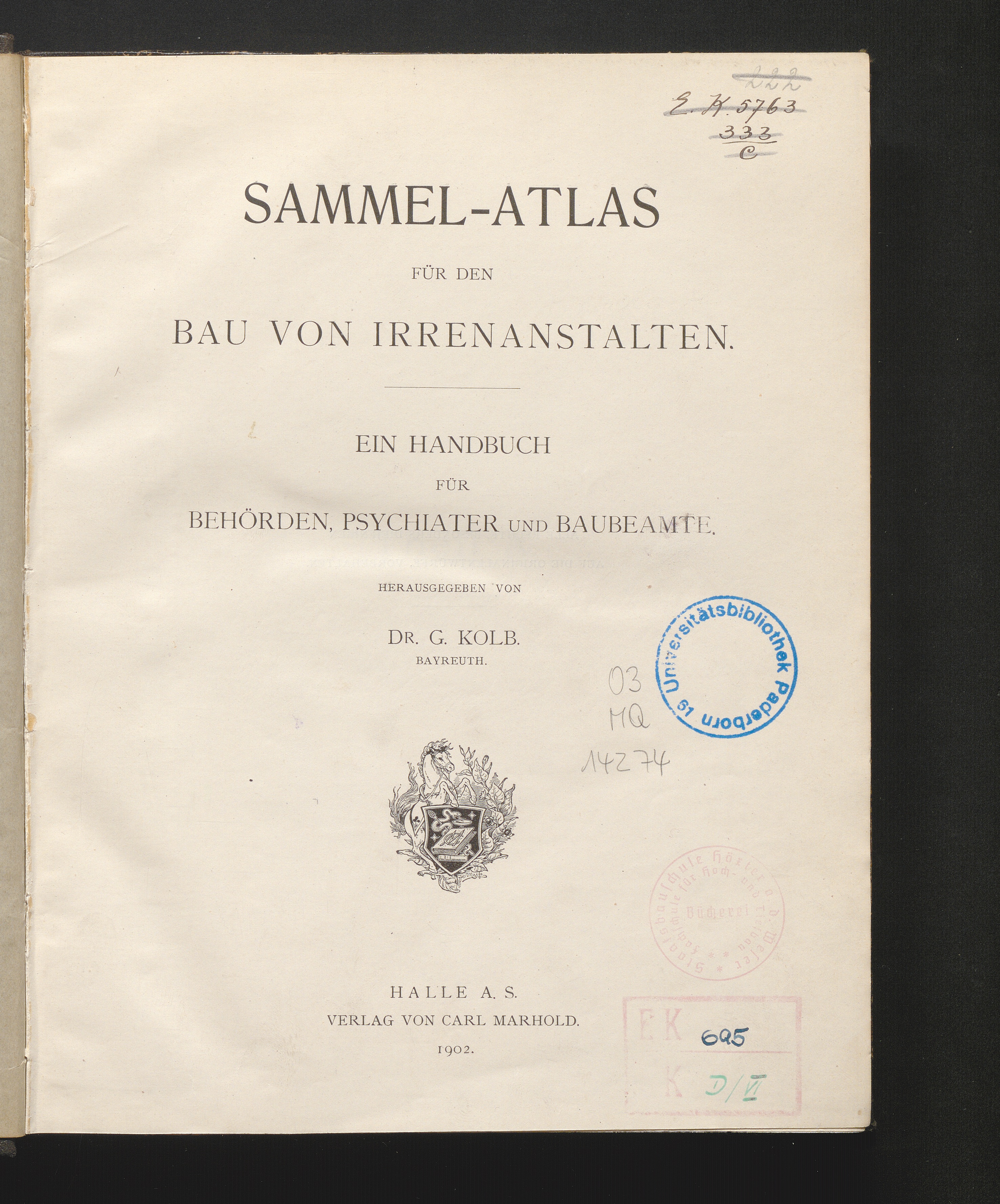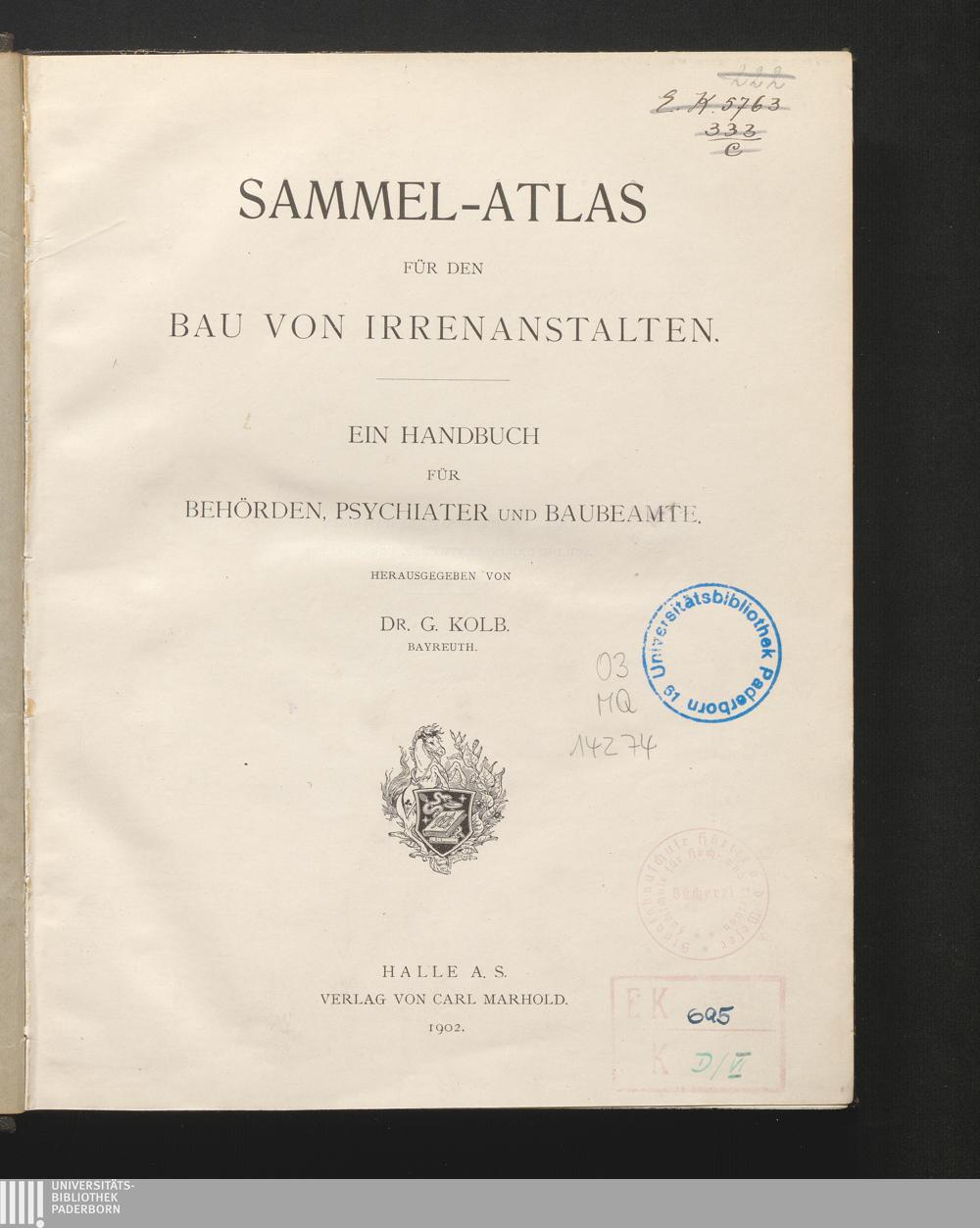 A/B (1902) Sammel-Atlas für den Bau von Irrenanstalten : ein Handbuch für Behörden, Psychiater und Baubeamte / hrsg. von G. Kolb