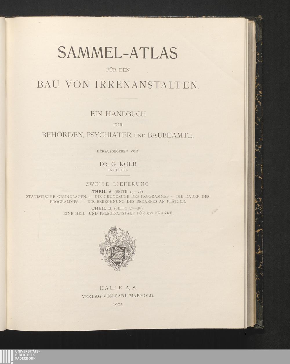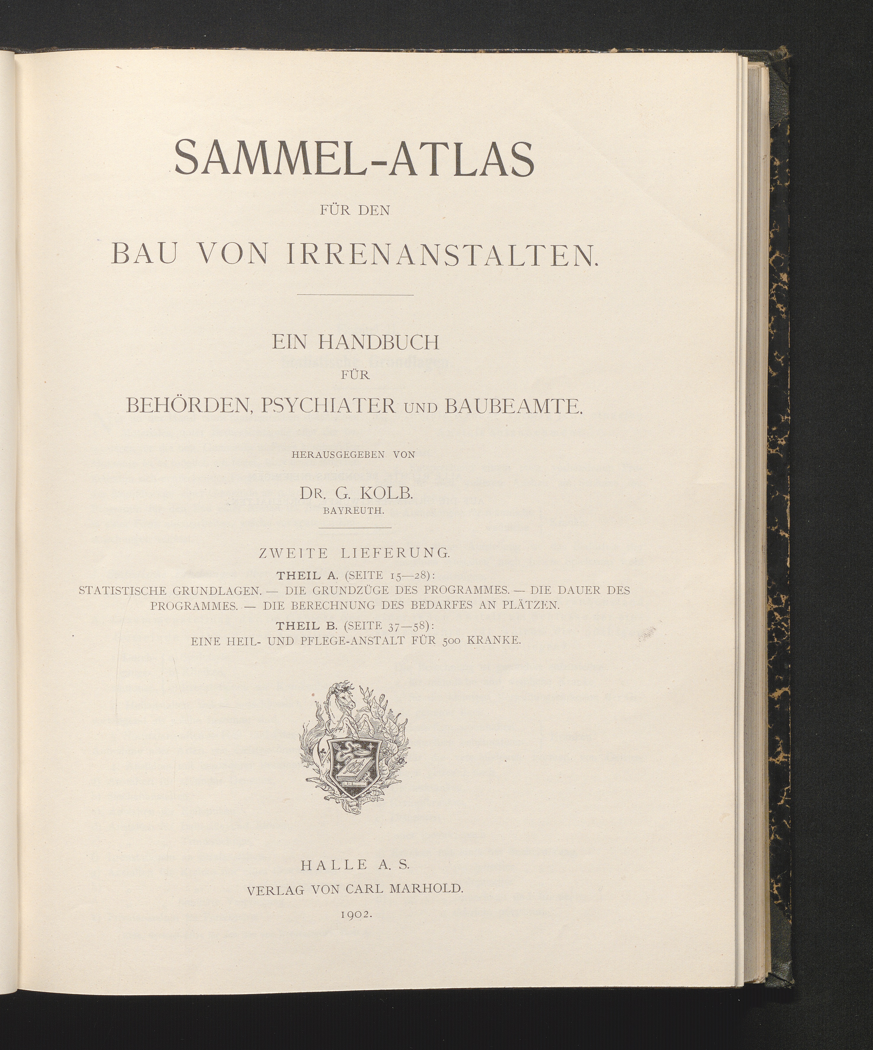 A/B (1902) Sammel-Atlas für den Bau von Irrenanstalten : ein Handbuch für Behörden, Psychiater und Baubeamte / hrsg. von G. Kolb