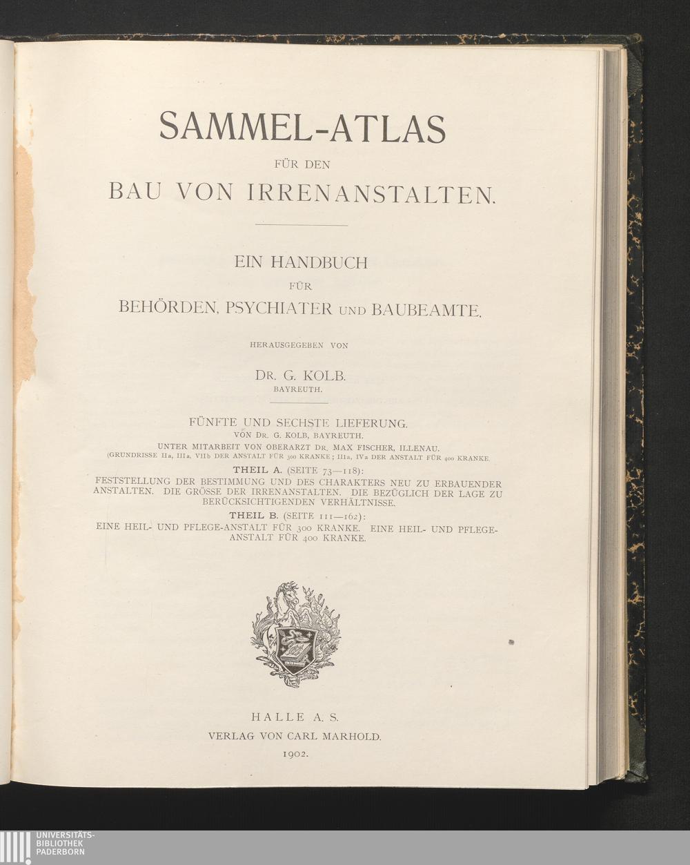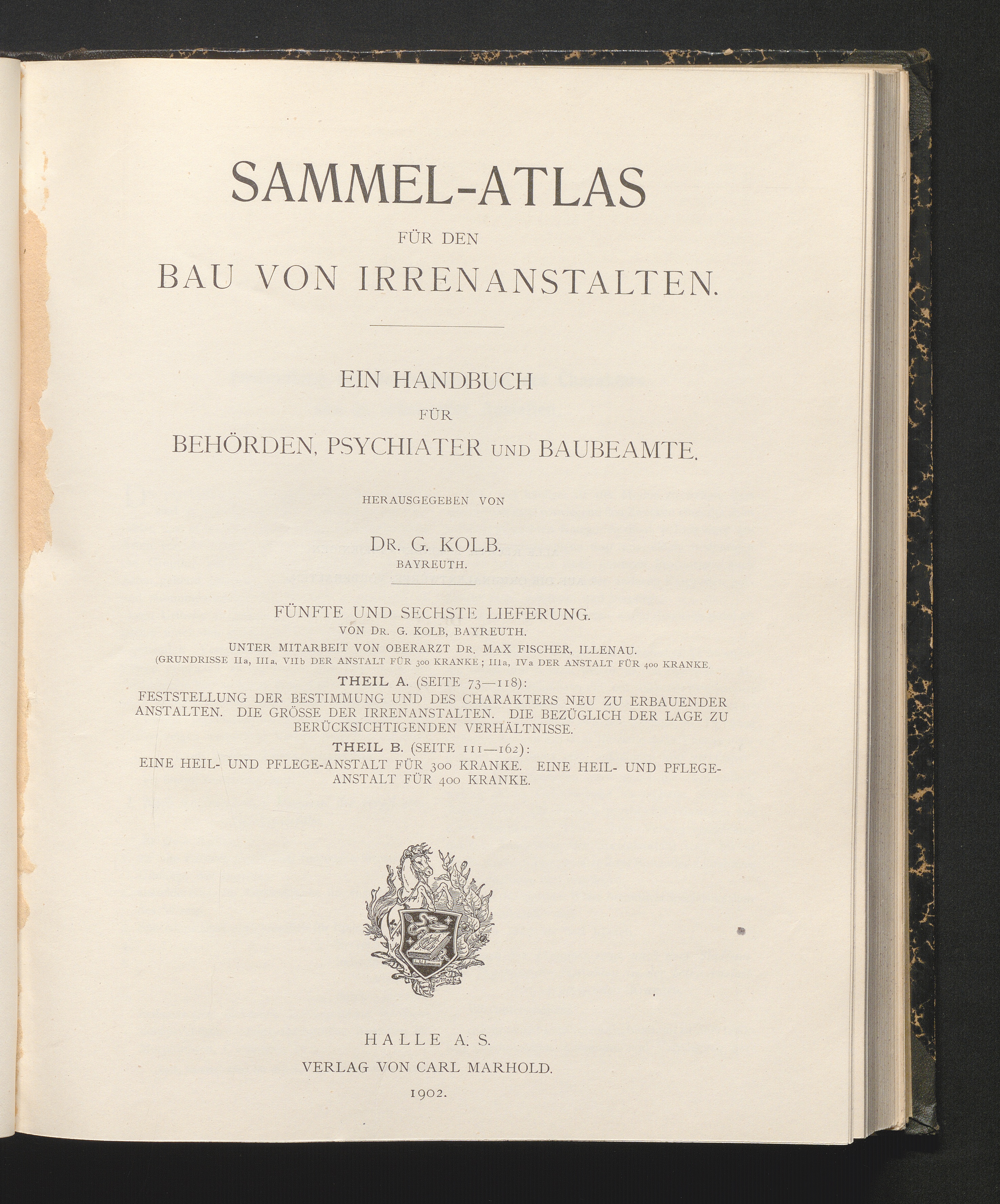 A/B (1902) Sammel-Atlas für den Bau von Irrenanstalten : ein Handbuch für Behörden, Psychiater und Baubeamte / hrsg. von G. Kolb