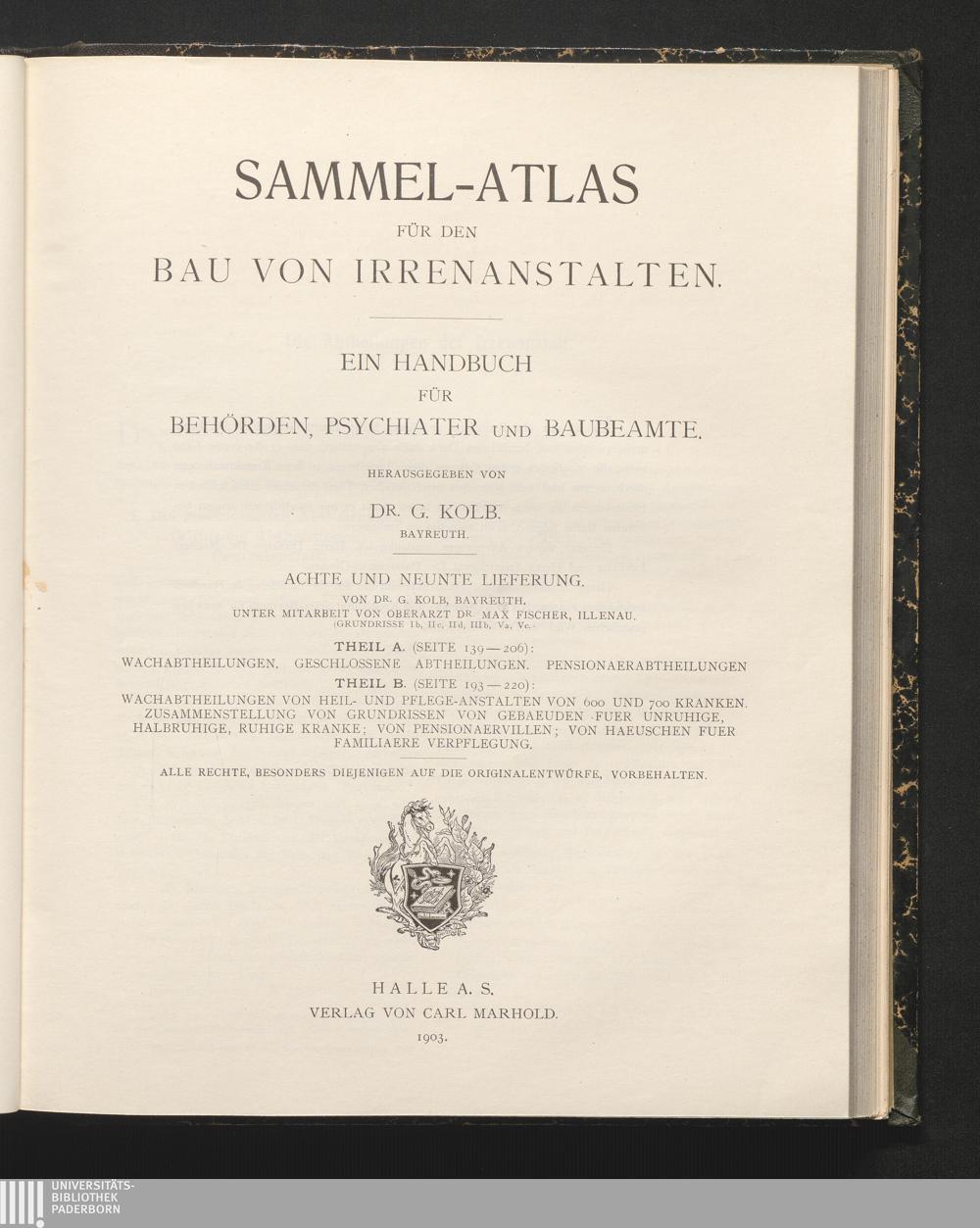 A/B (1902) Sammel-Atlas für den Bau von Irrenanstalten : ein Handbuch für Behörden, Psychiater und Baubeamte / hrsg. von G. Kolb