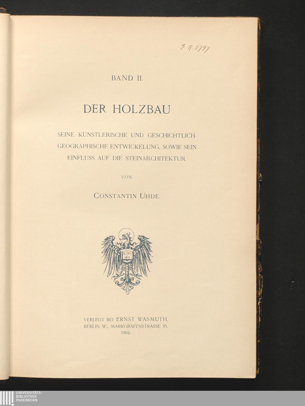 Der Holzbau : seine künstlerische und geschichtlich-geographische Entwickelung, sowie sein Einfluss auf die Steinarchitektur / von Constantin Uhde