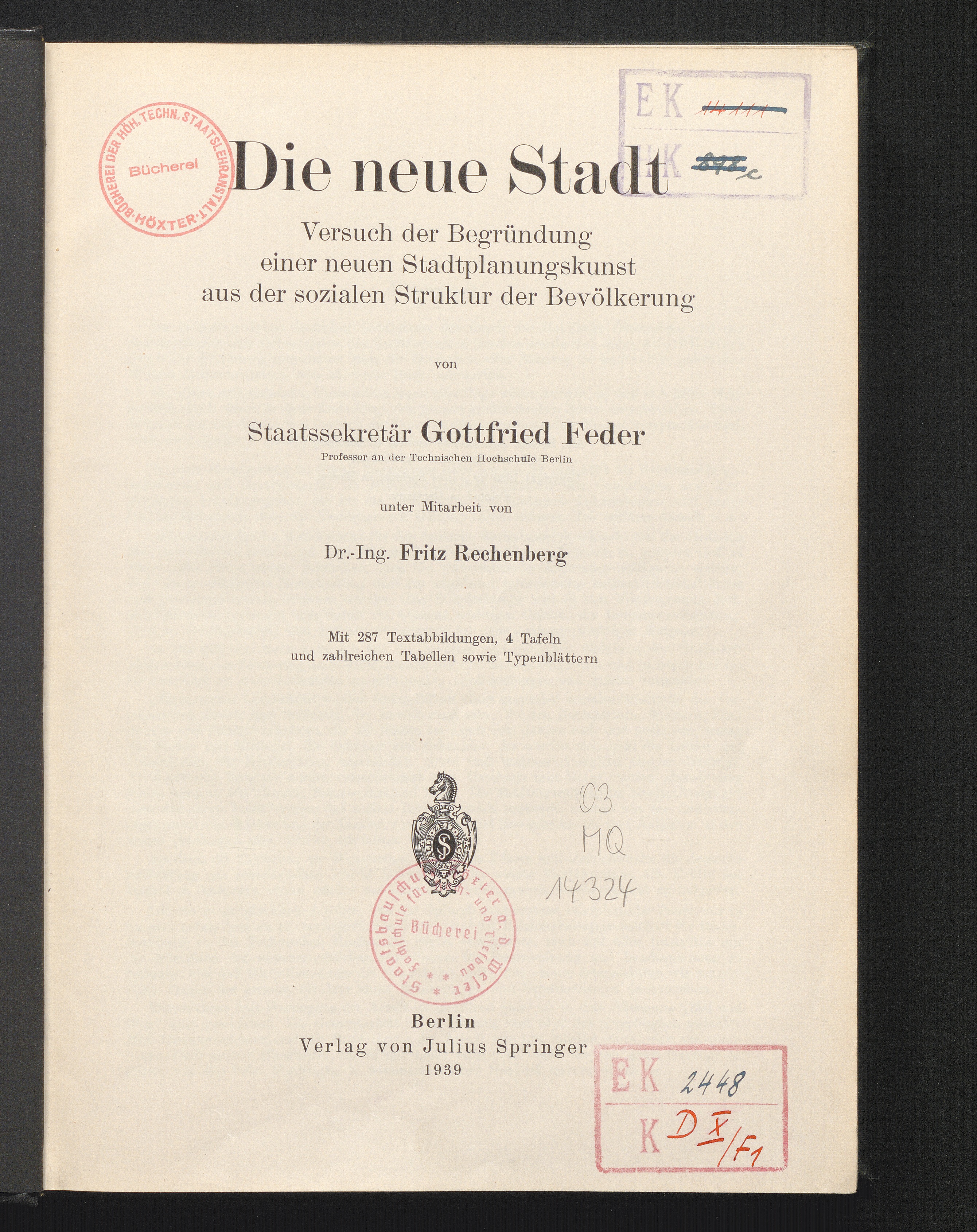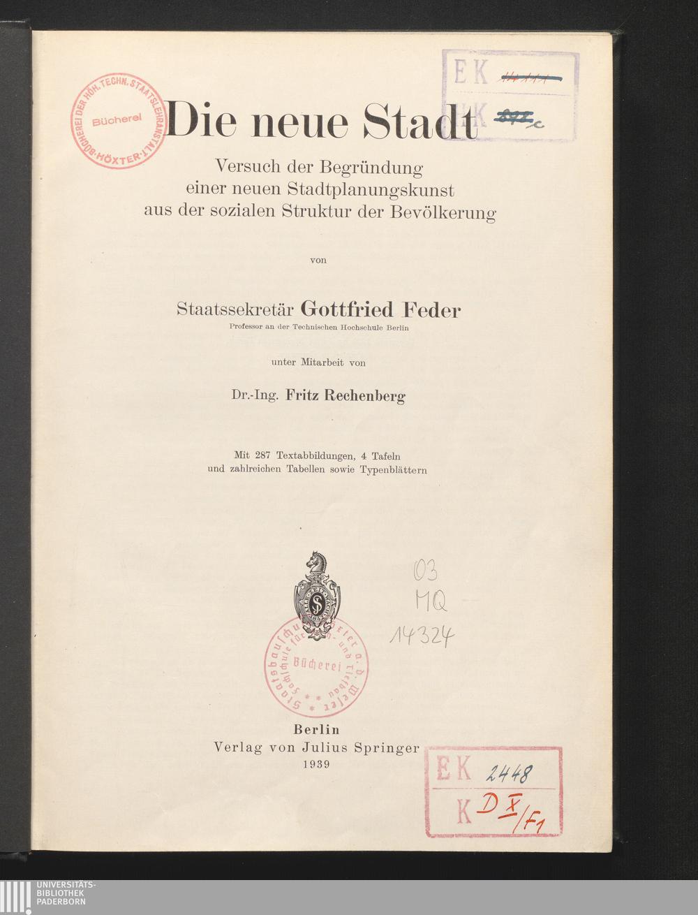 Die neue Stadt : Versuch der Begründung einer neuen Stadtplanungskunst aus der sozialen Struktur der Bevölkerung / von Gottfried Feder