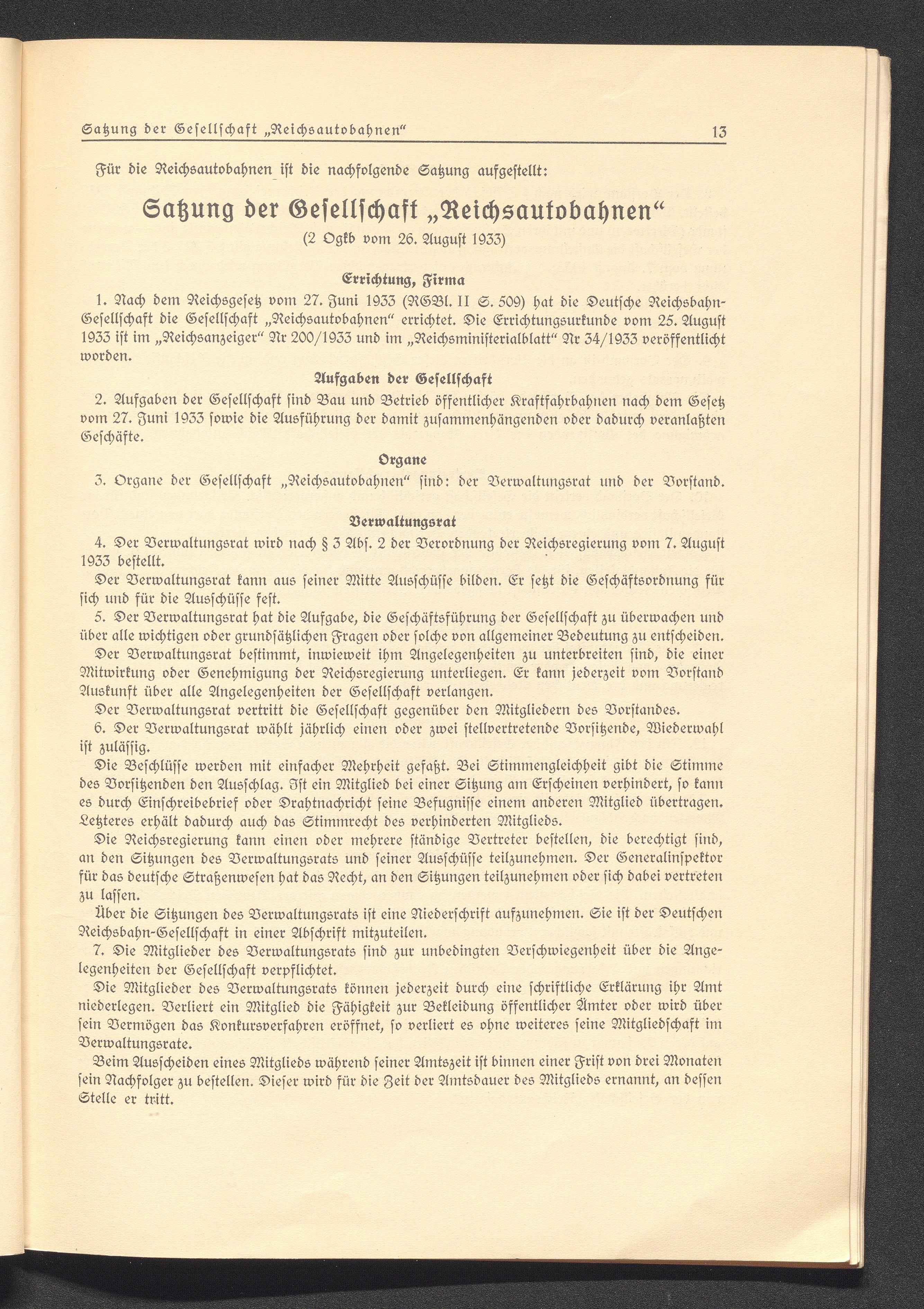 Satzung der Gesellschaft "Reichsautobahnen"