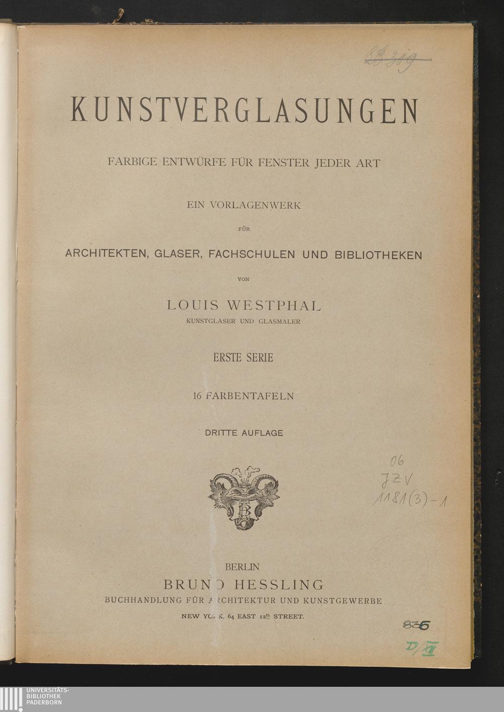 1 (1896) Kunstverglasungen : farbige Entwürfe für Fenster jeder Art ; ein Vorlagenwerk für Architekten, Glaser, Fachschulen und Bibliotheken / von Louis Westphal