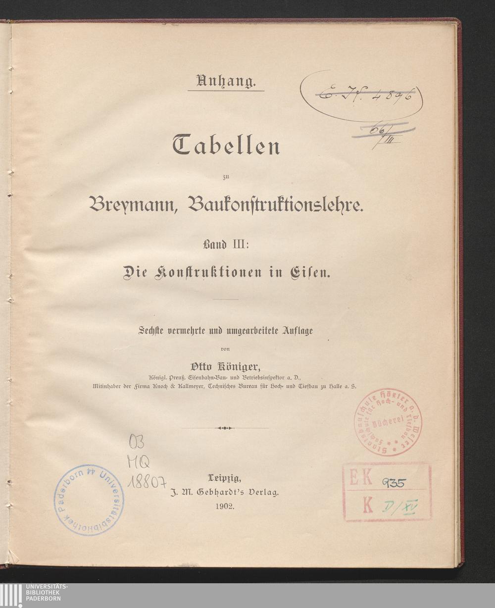 Die Konstruktionen in Eisen : Anhang: Tabellen / von Otto Königer