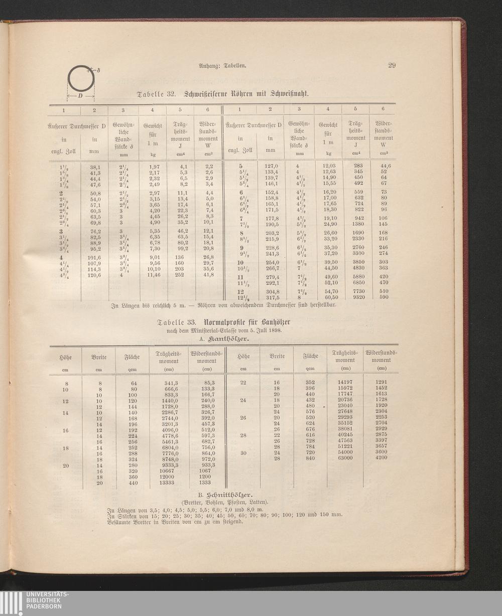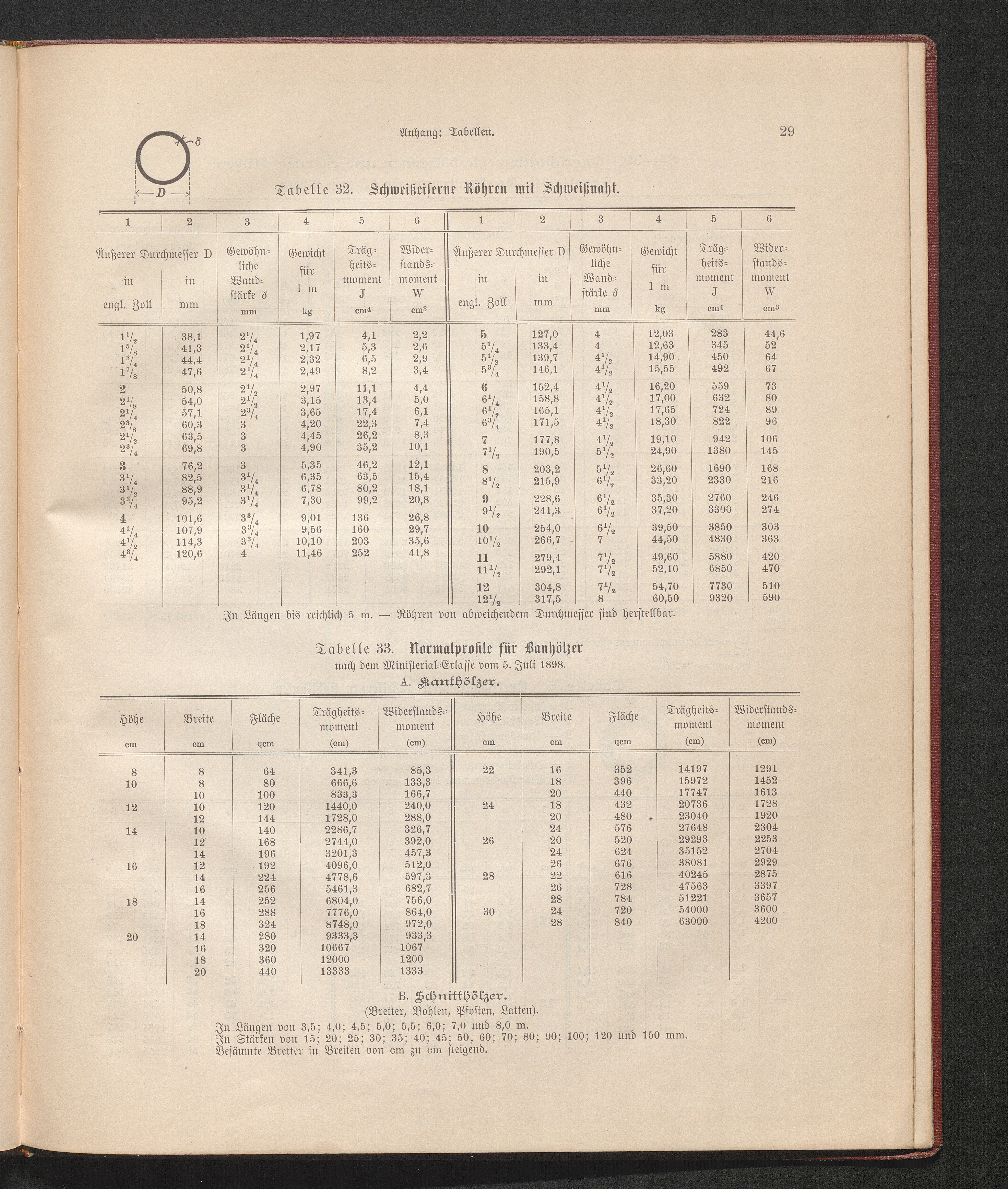 Tabelle 33. Normalprofile für Bauhölzer nach dem Ministerialerlasse vom 5. Juli [...]