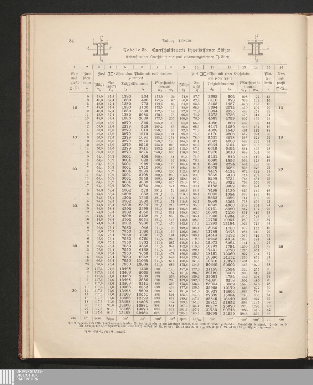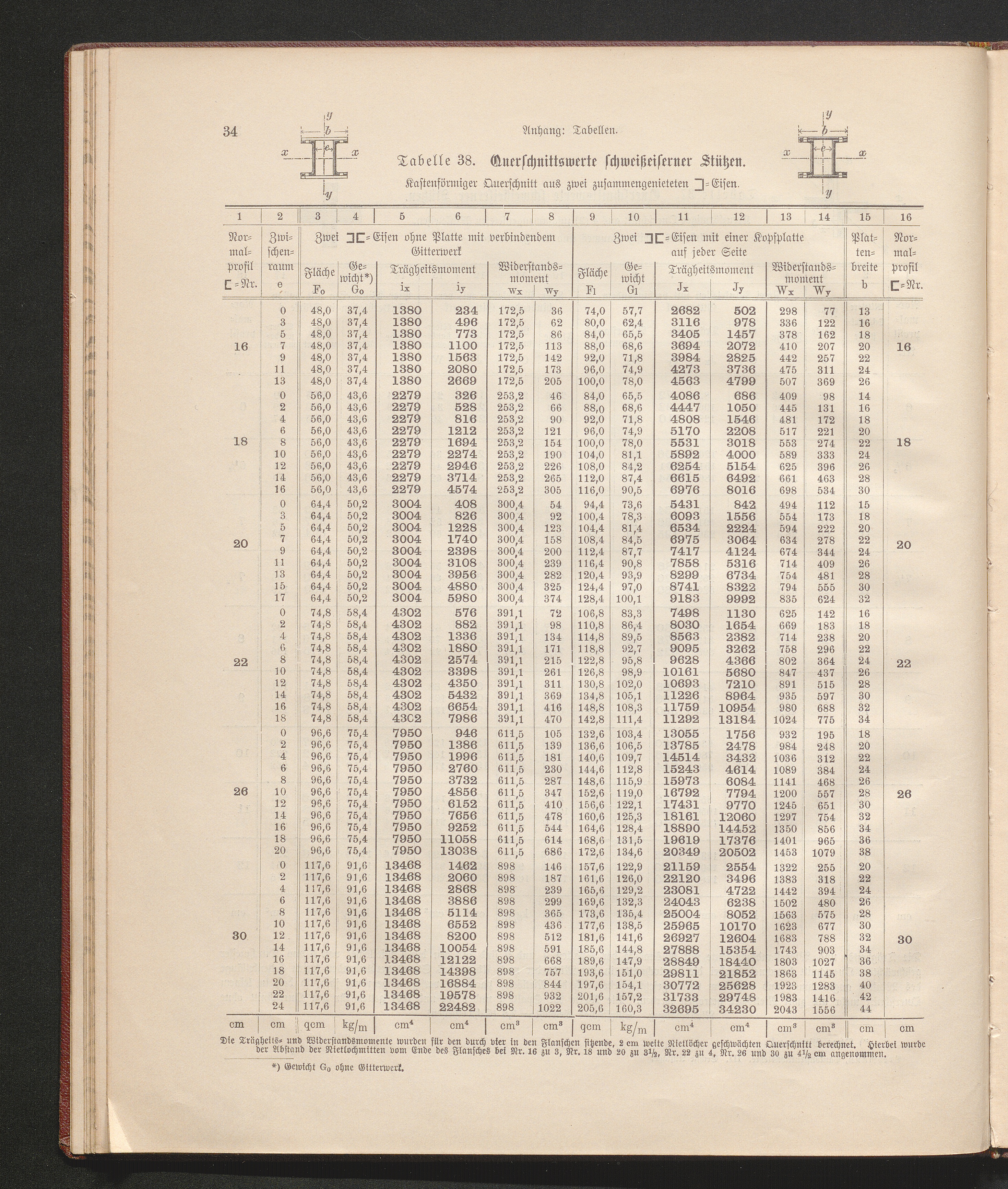 Tabelle 38. Querschnittswerte schweißeiserner Stützen. Kastenförmiger Querschnitt[...]