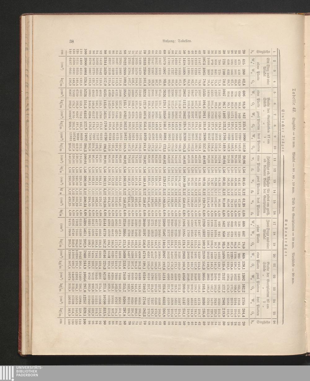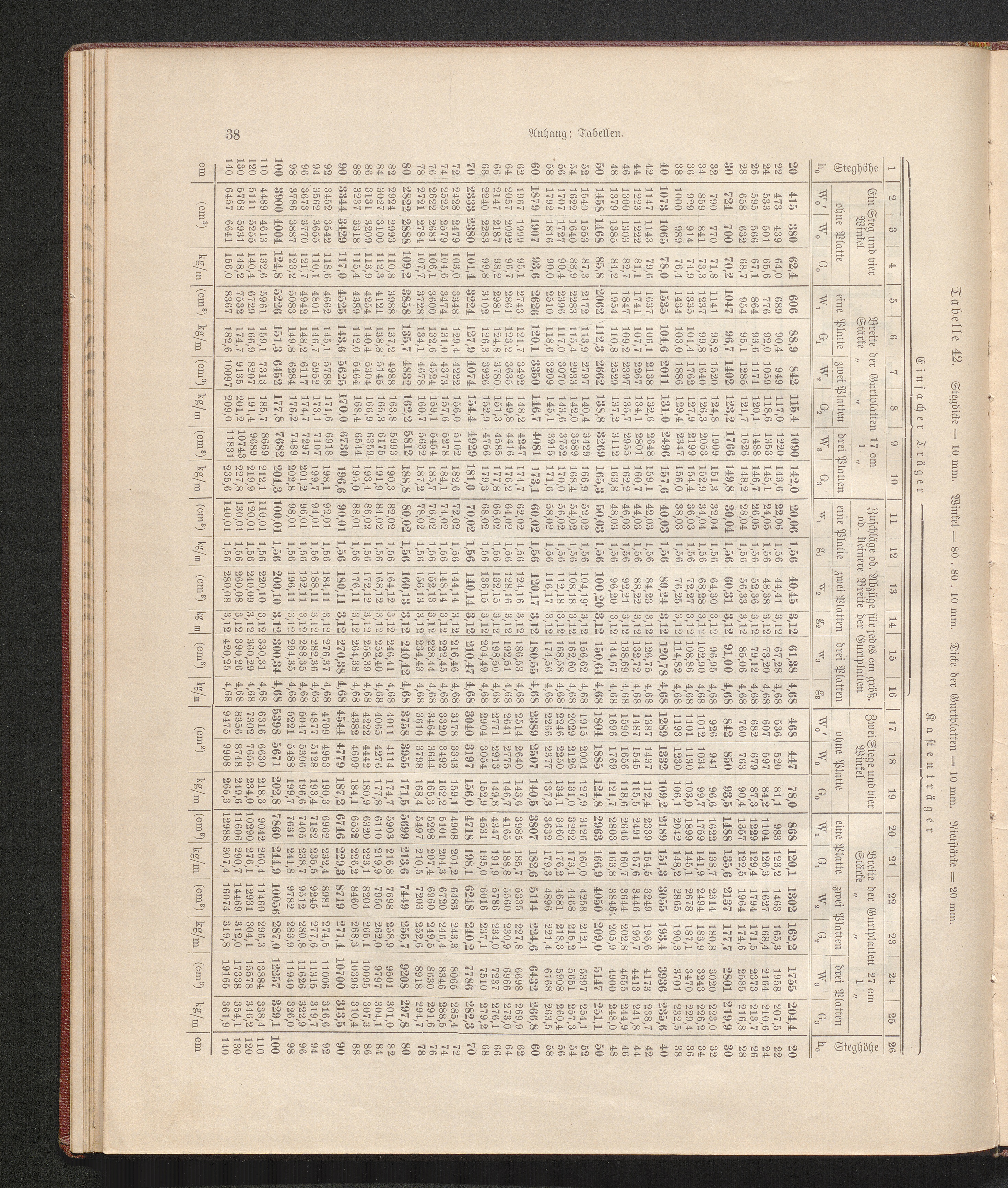 Tabelle 42. Stegdicke=10 mm. Winkel=80. 80.10 mm. Dicke der Gurtplatten=10 mm. Nietstärke=20[...]