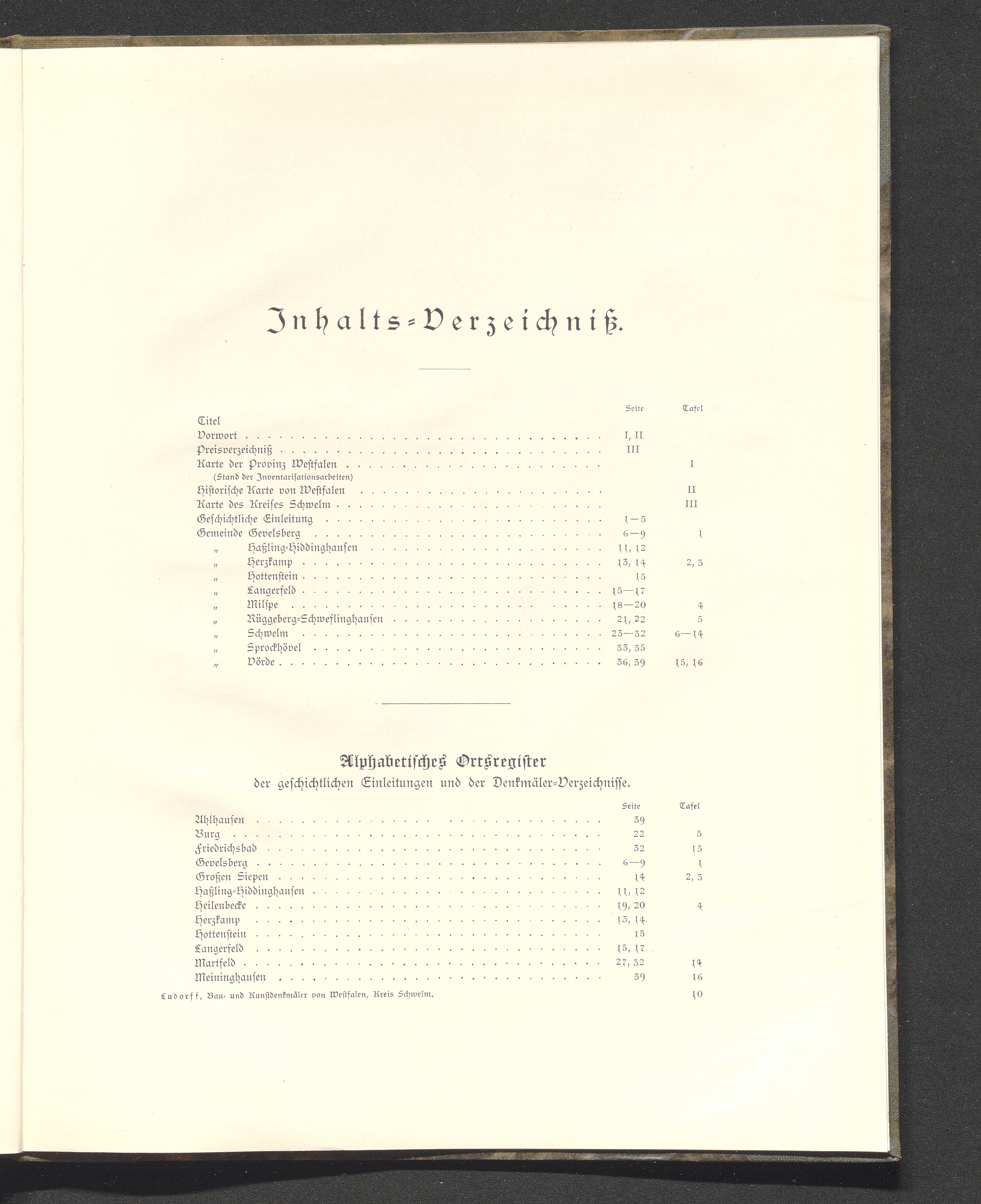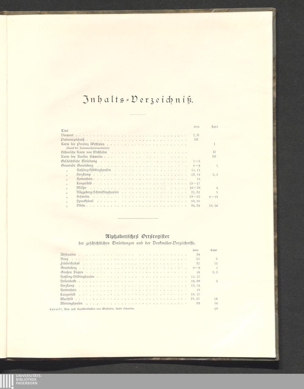 Alphabetisches Ortsregister der geschichtlichen Einleitungen und der Denkmäler-Verzeichnisse.
