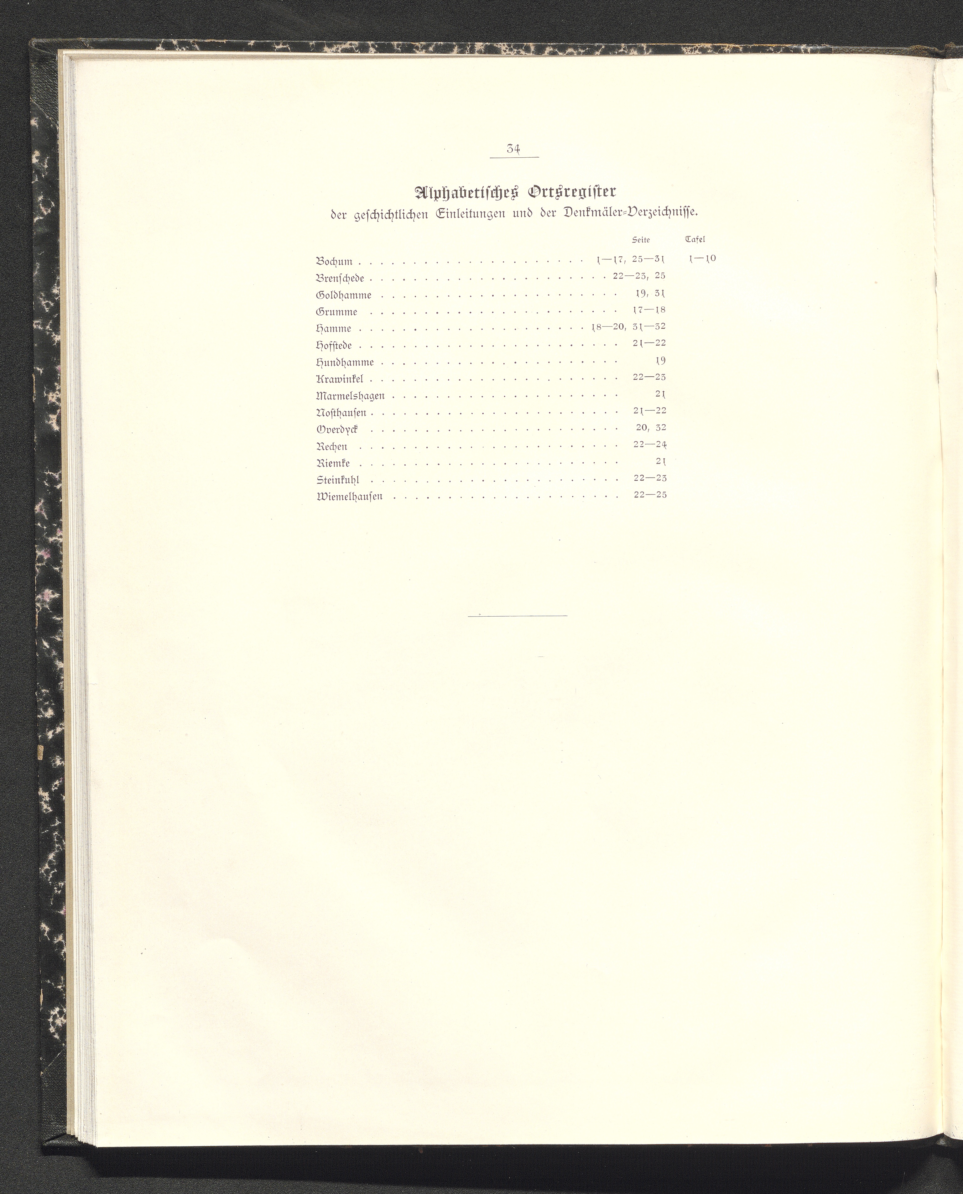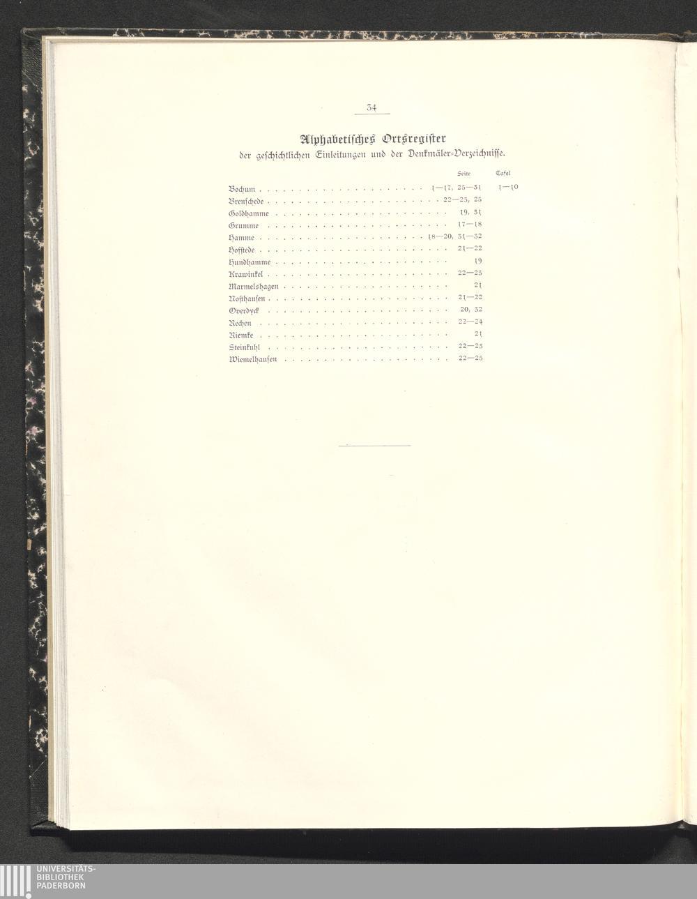 Alphabetisches Ortsregister der geschichtlichen Einleitungen und der Denkmäler-Verzeichnisse.