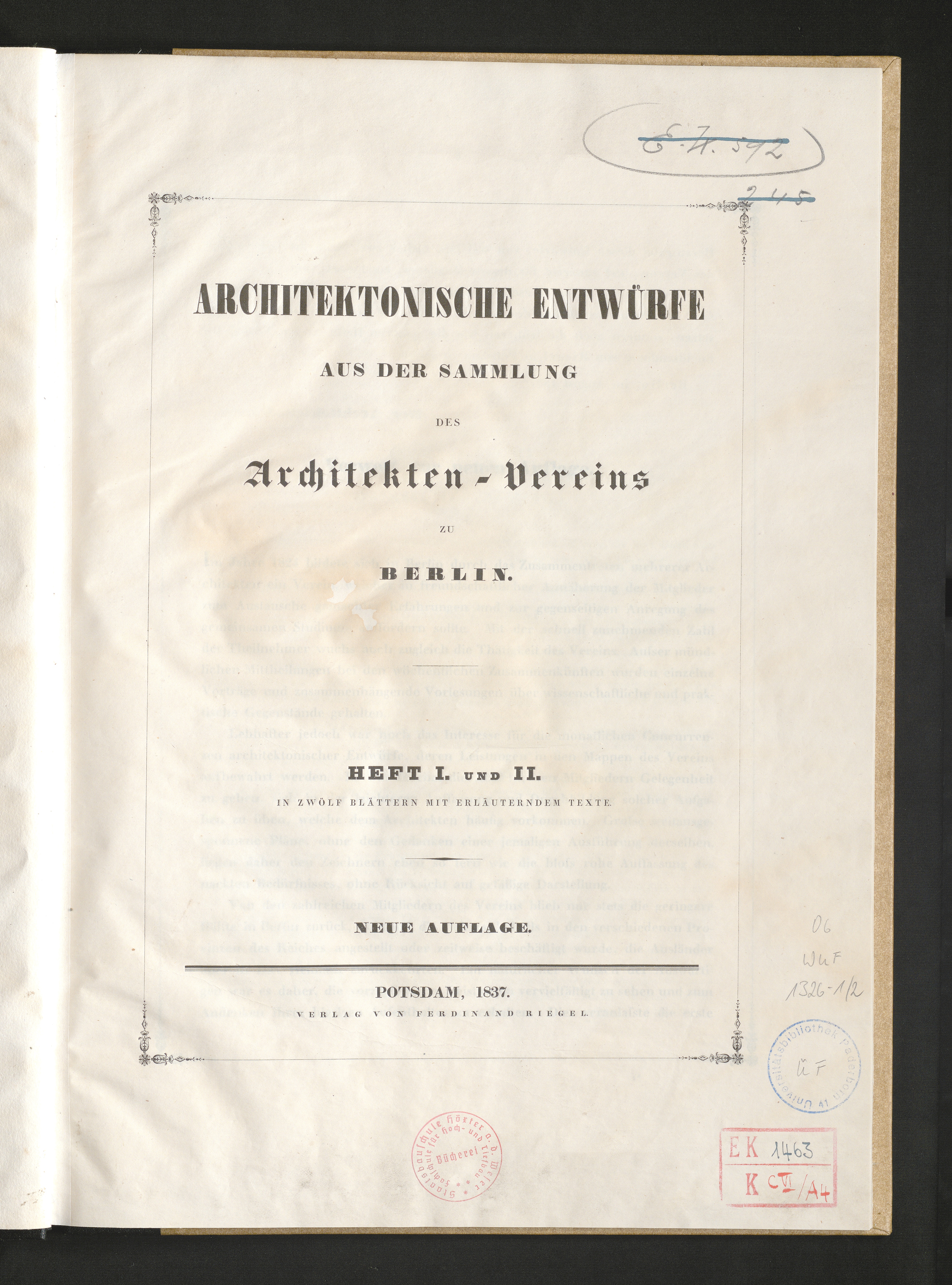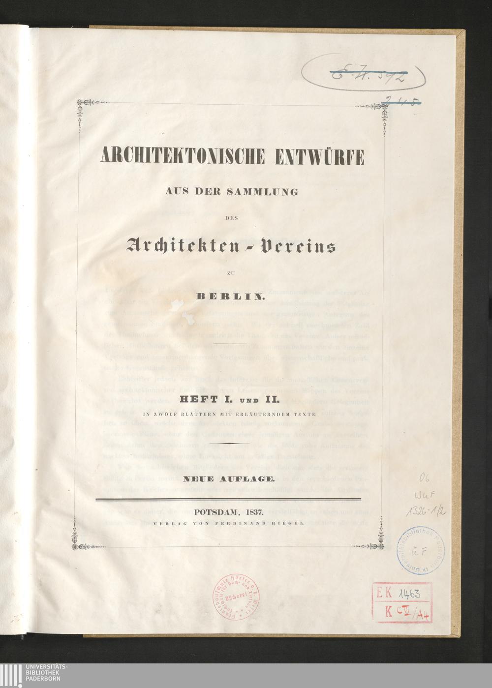 1/2 (1837) Architektonische Entwürfe Aus Der Sammlung Des Architekten-Vereins Zu Berlin