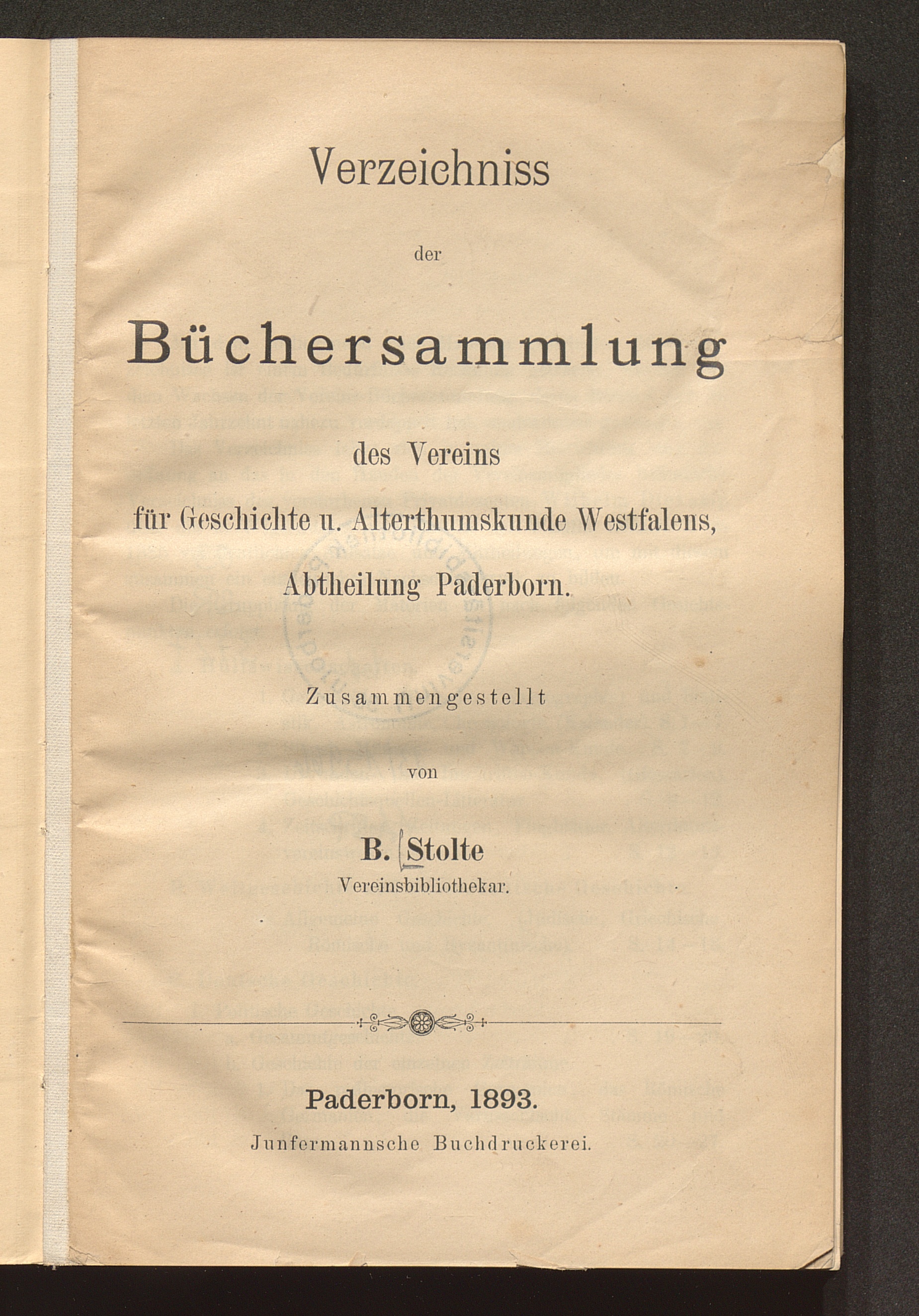 Verzeichniss der Büchersammlung des Vereins für Geschichte und Alterthumskunde Westfalens, Abtheilung Paderborn / zusammengestellt von B. Stolte