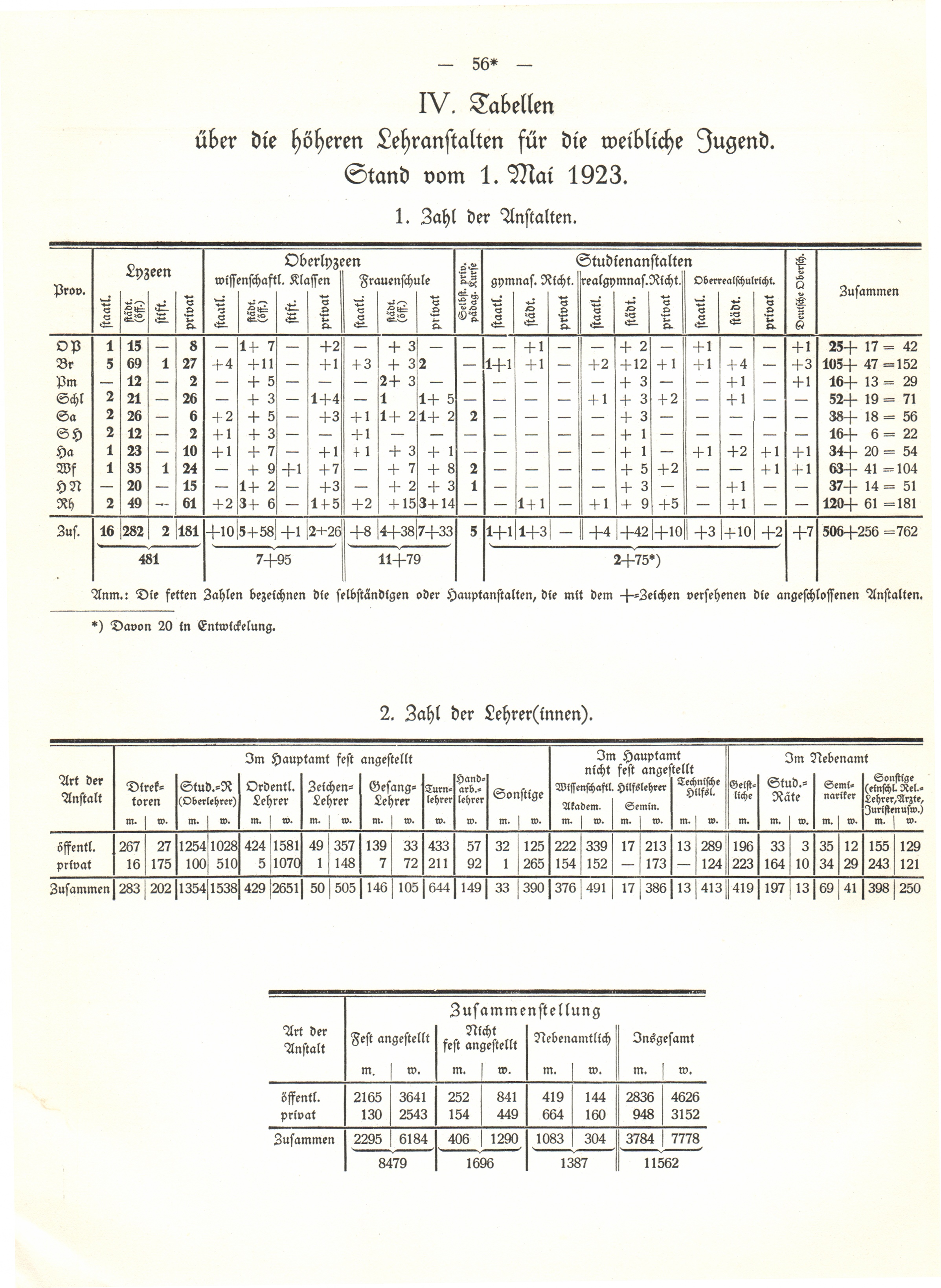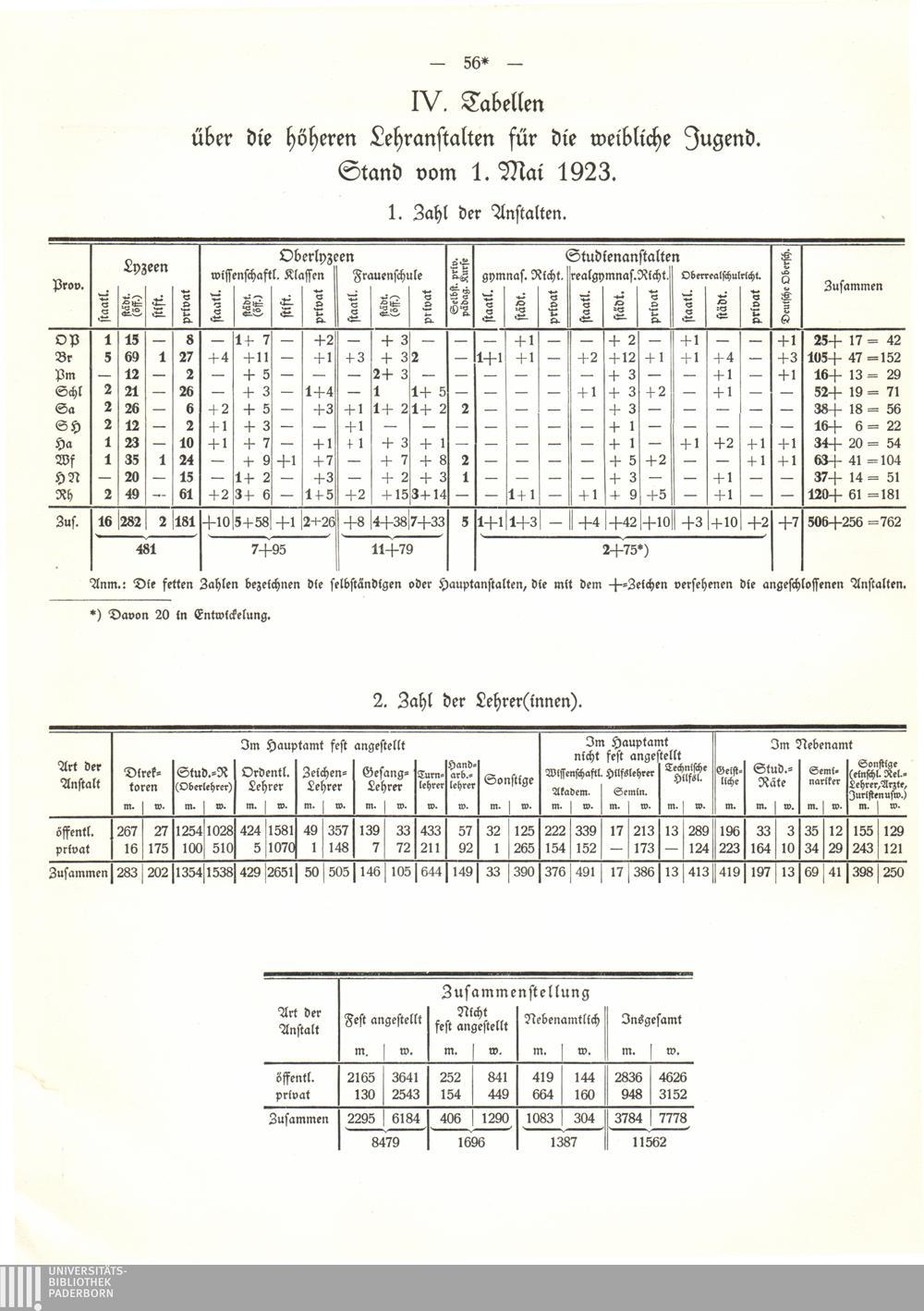 IV. Tabellen über die höheren Lehranstalten für die weibliche Jugend. Stand vom 1.[...]