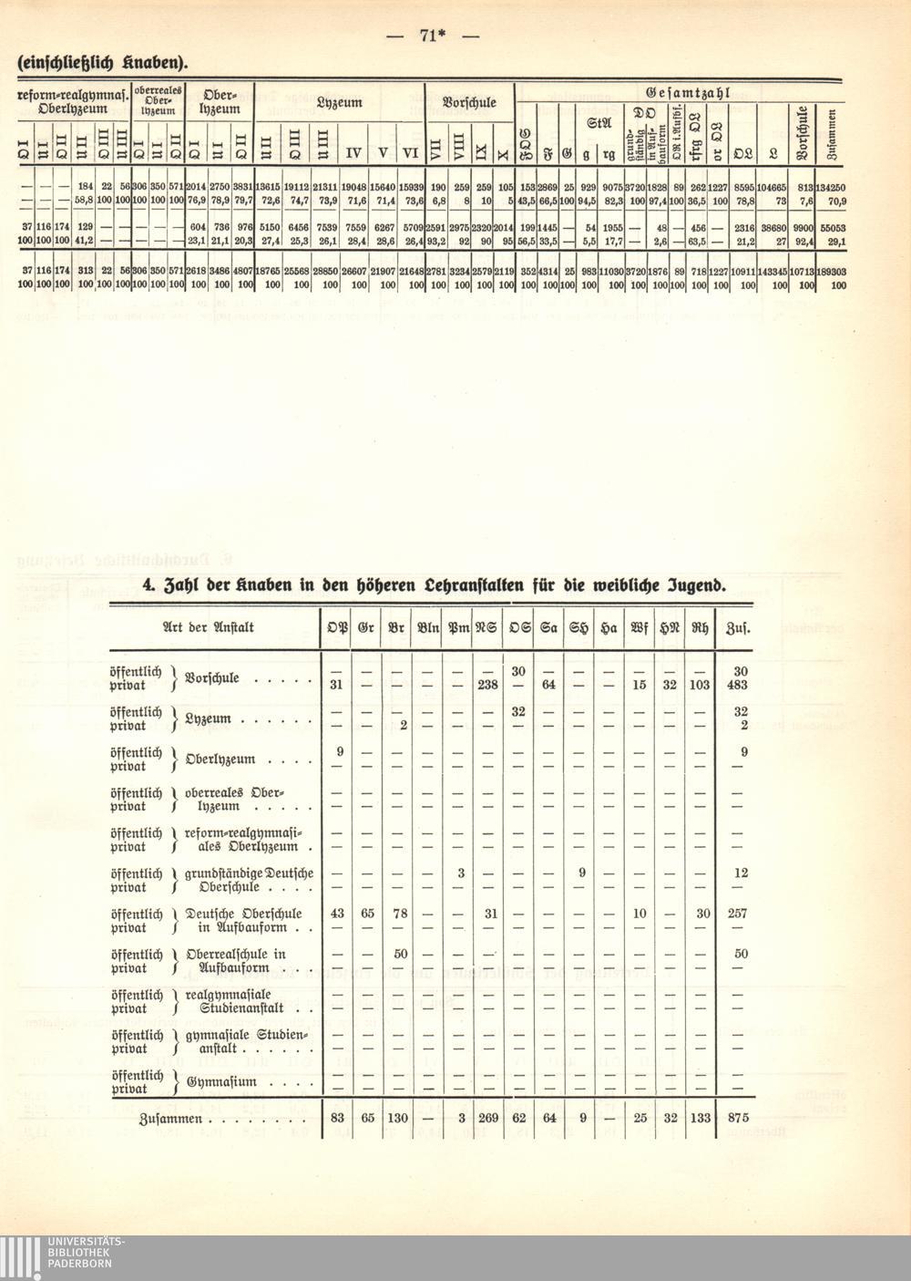 IV. Tabellen über die höheren Lehranstalten für die weibliche Jugend. Stand vom 1.[...]