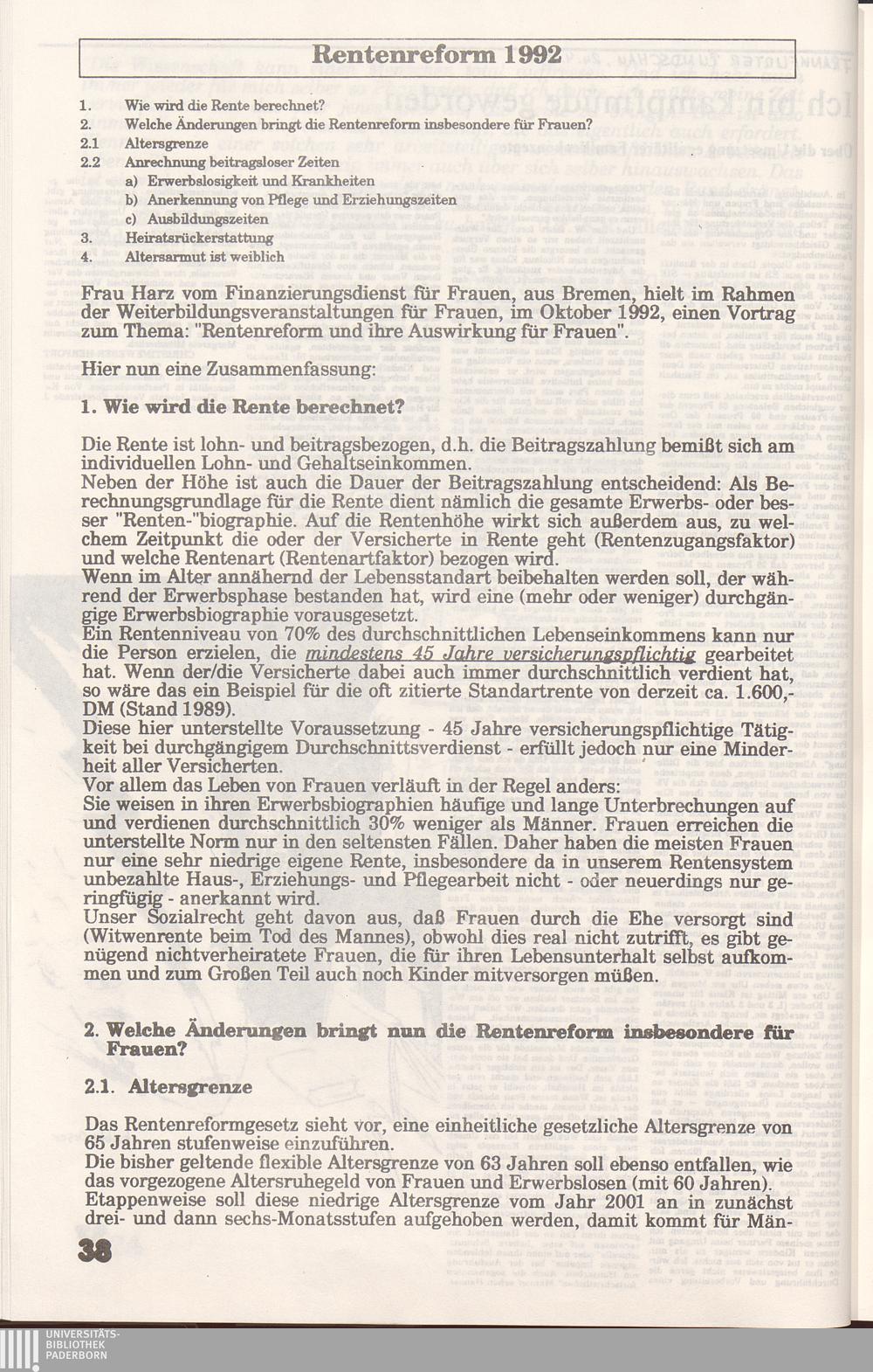 Rentenreform 1992 und ihre Änderungen für Frauen