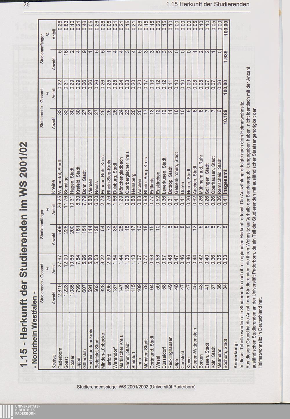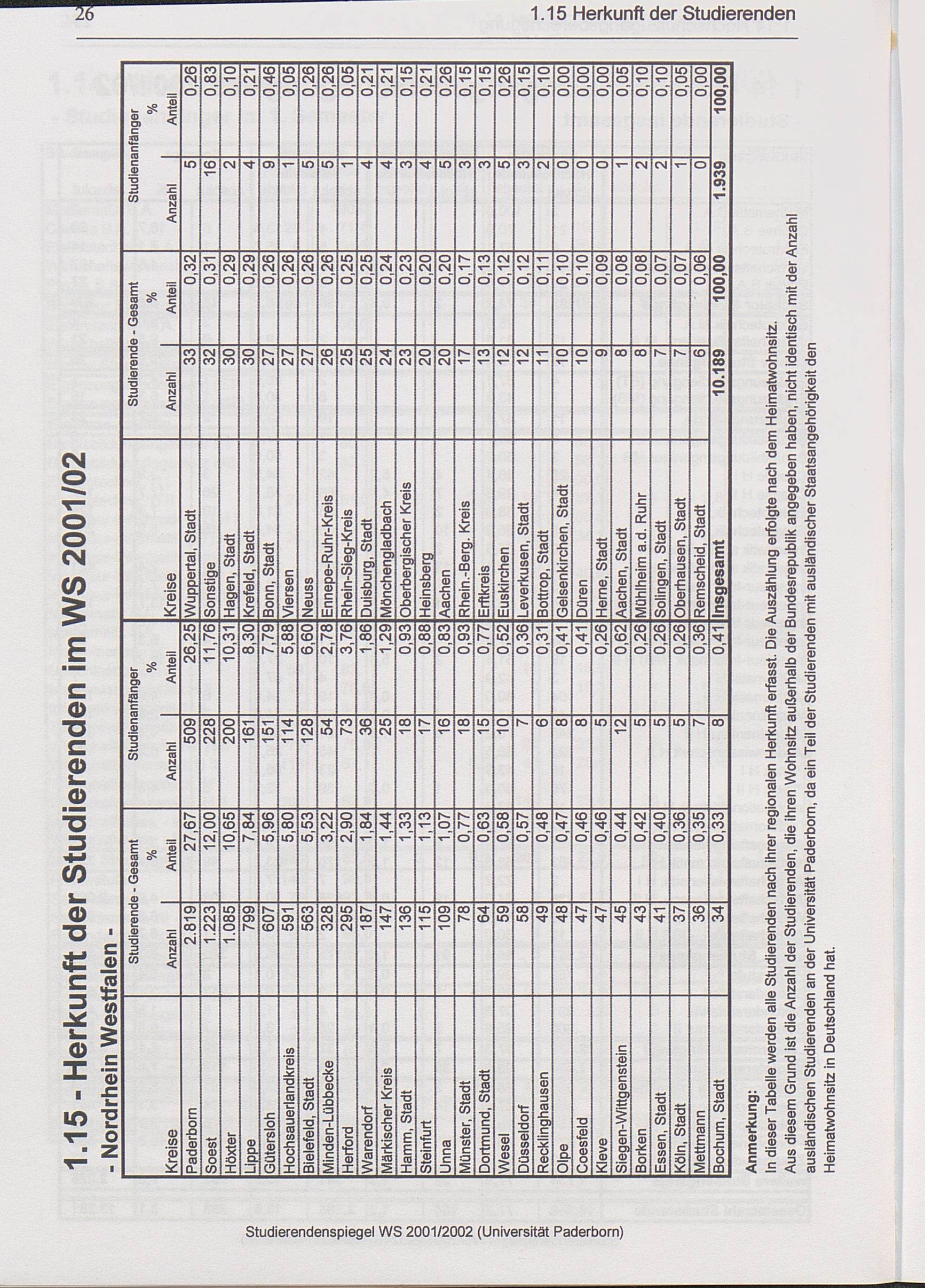 1.15 Herkunft der Studierenden innerhalb von NRW nach Kreisen