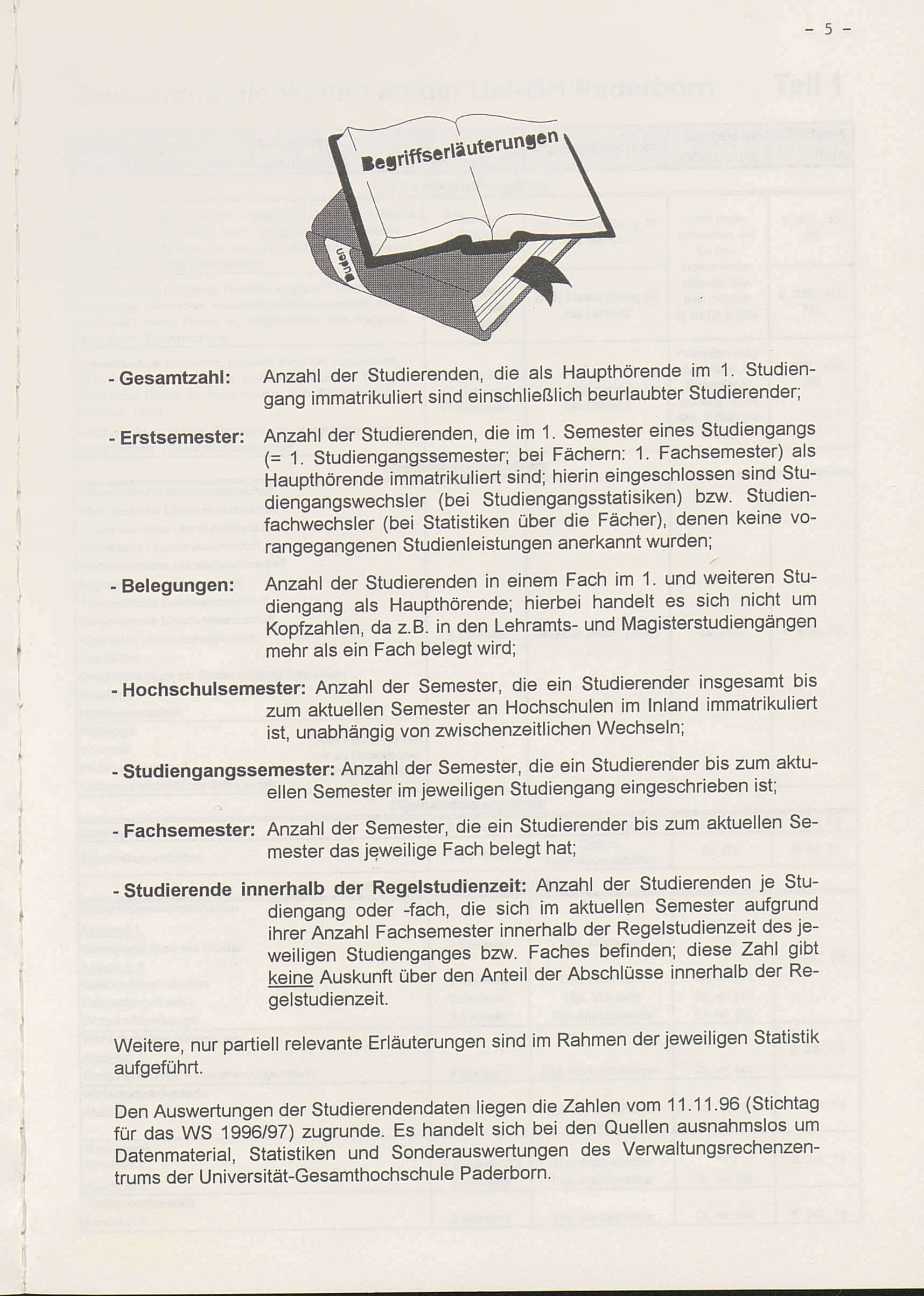 Studierendenzahlen im Überblick im Wintersemester 1996/97 (Studiengangszahlen, Belegungen je Fach, Zweithörer; Alters- und Hochschulsemesterstruktur)