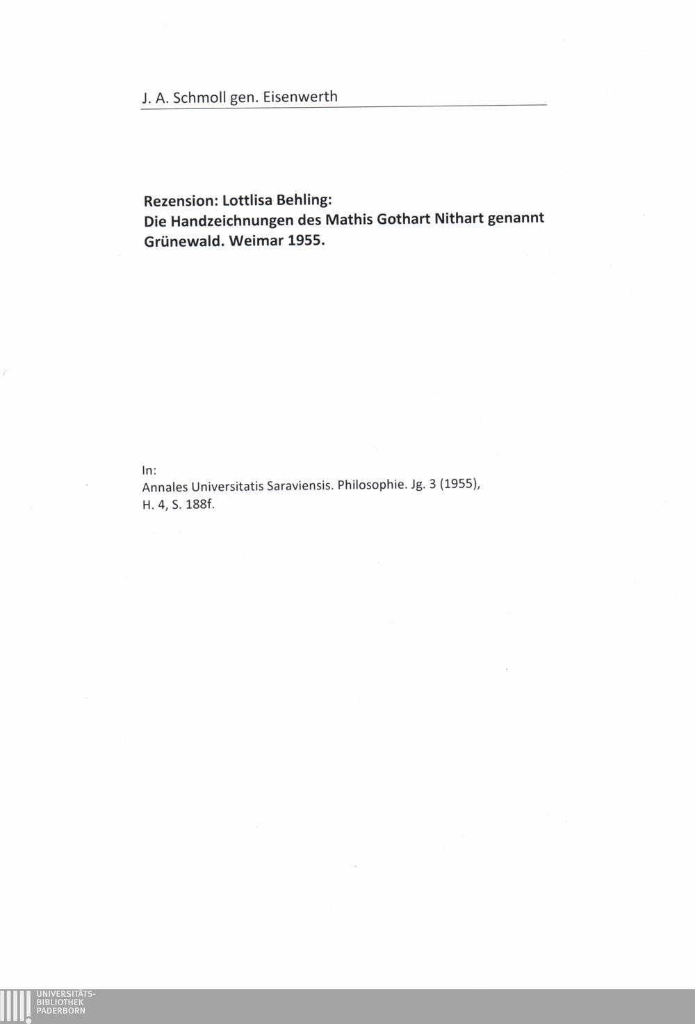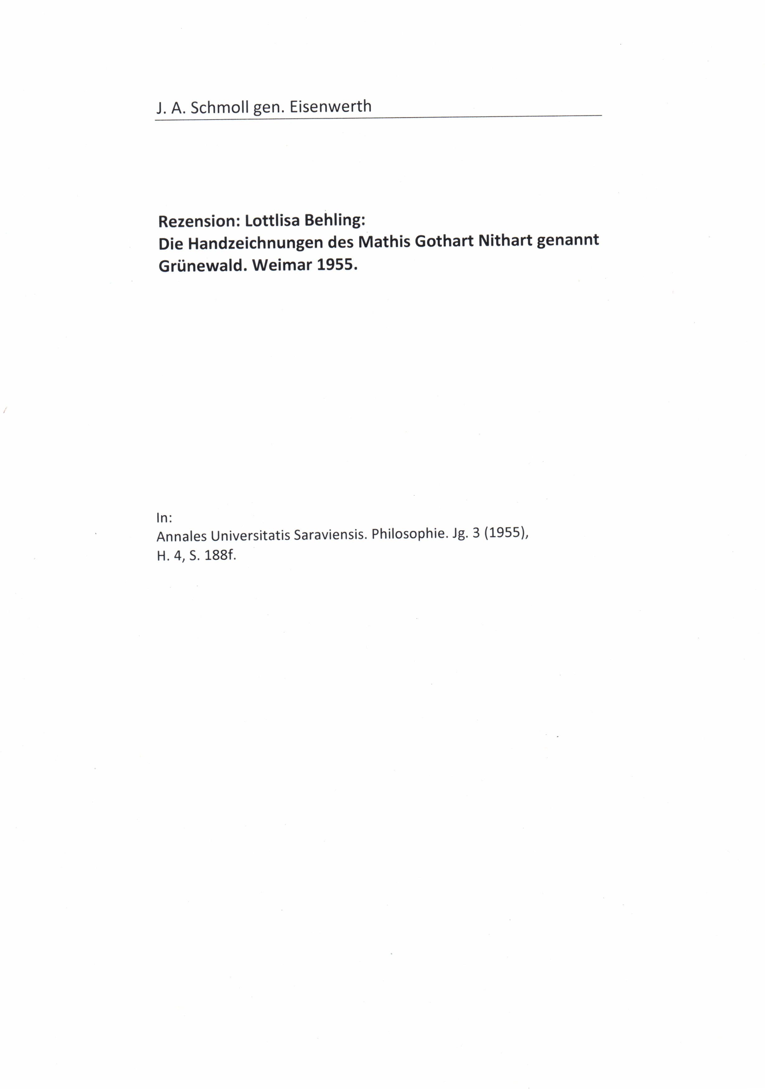 Rezension Lottlisa Behling. Die Handzeichnungen des Mathis Gothart Nithart genannt Grünewald, Weimar 1955 (H. Böhlau Nachfolger), 128 Textseiten mit 31 Abbildungen und 41 Bildtafeln / J.A. Schmoll gen. Eisenwerth