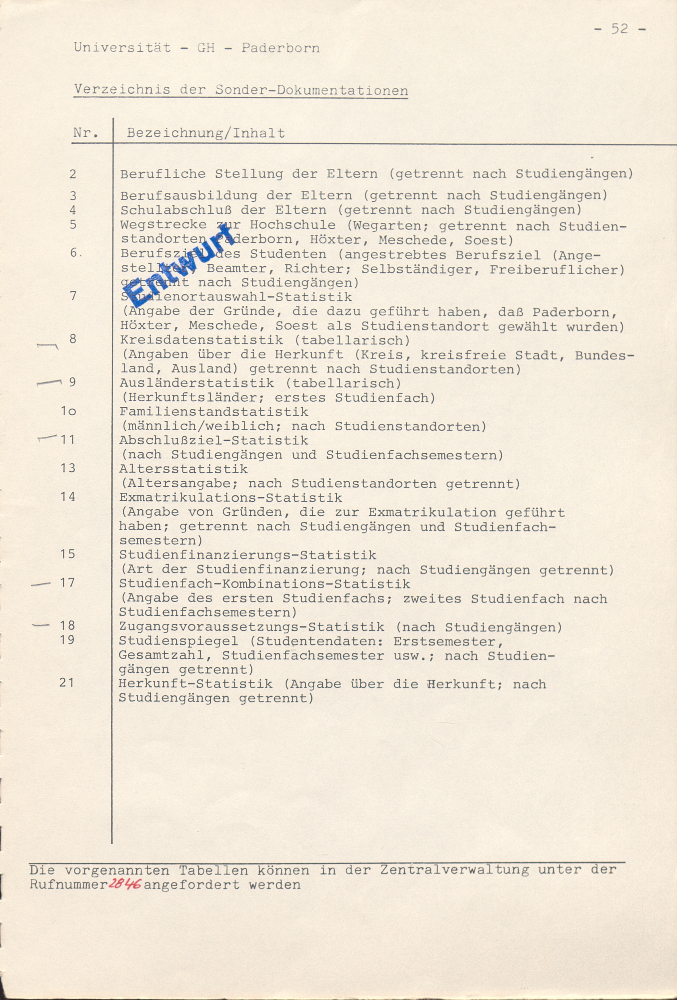 Verzeichnis der Sonderdokumentationen, die auf Anfrage zur Verfügung gestellt werden können