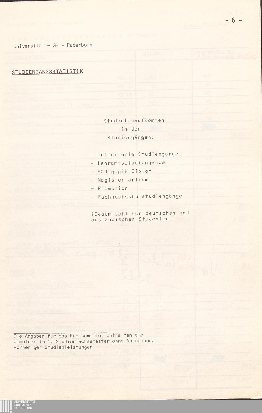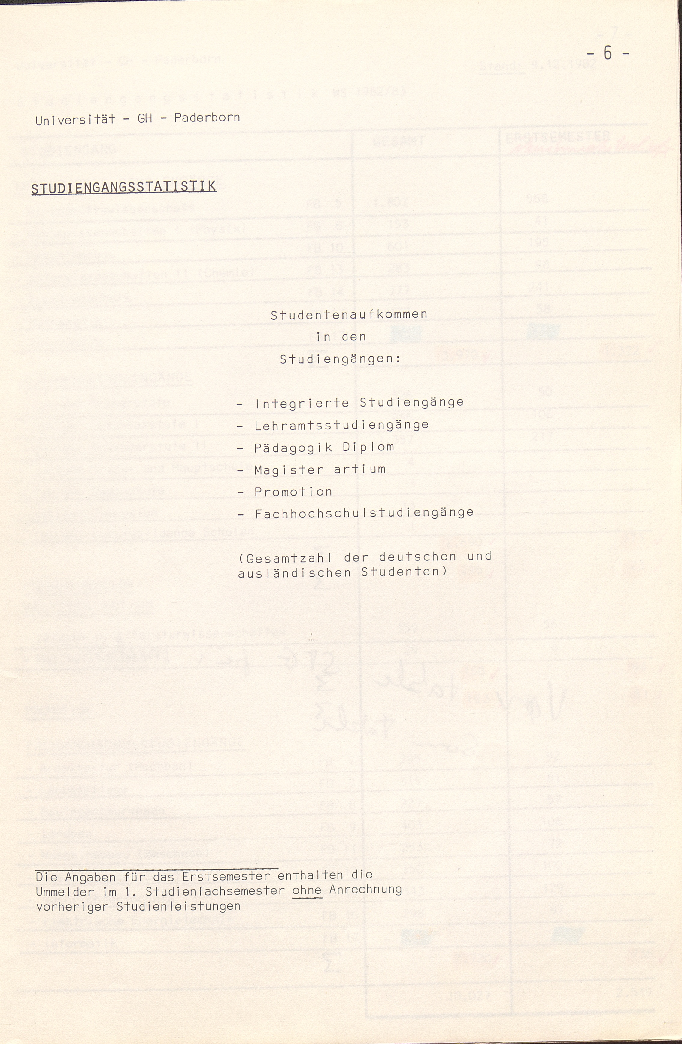 Studiengangsstatistik WS 1982/83 (Gesamtübersicht)