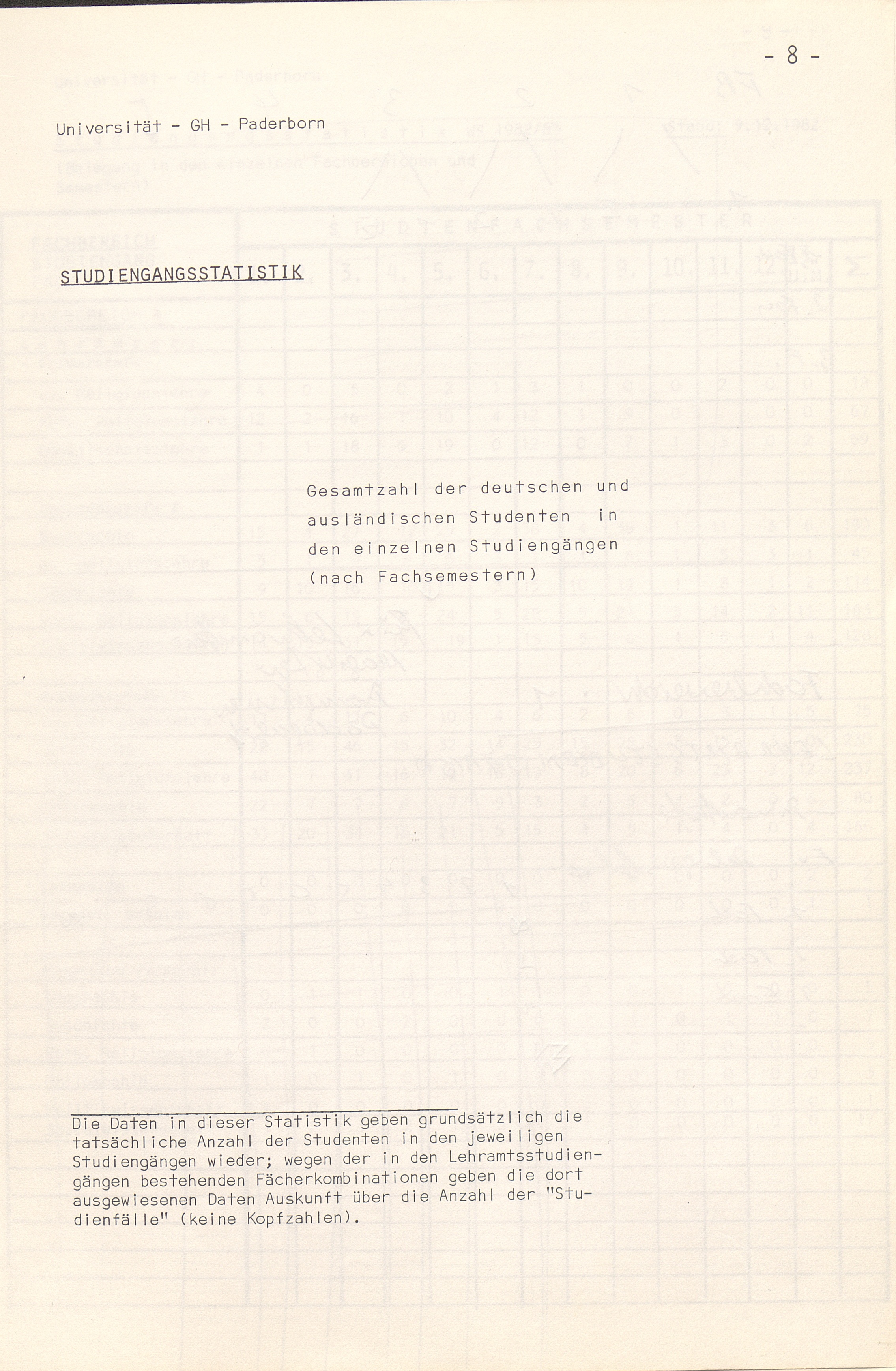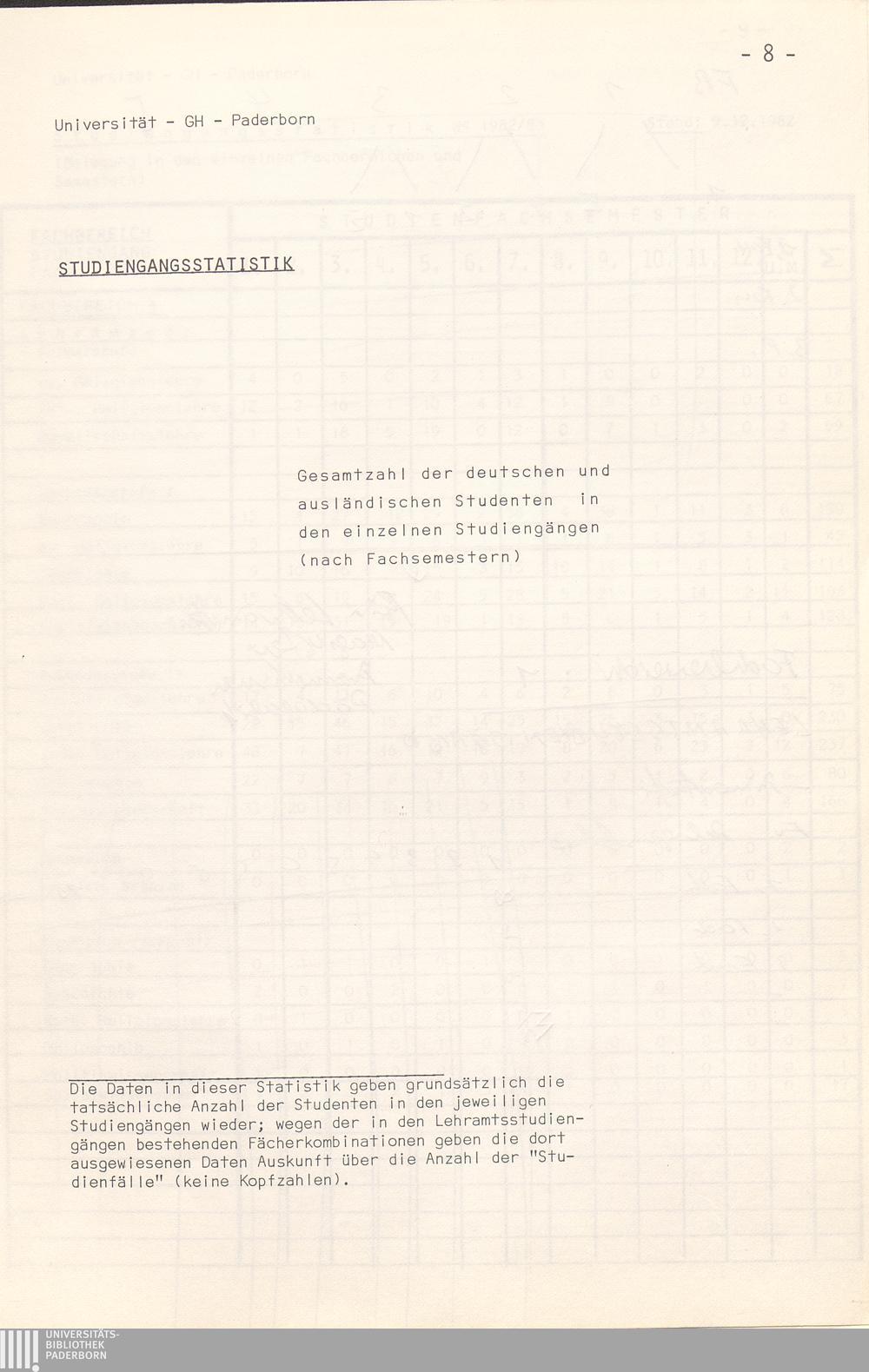 Studiengangsstatistik WS 1982/83 (Belegung in den einzelnen Studienfachsemestern[...]